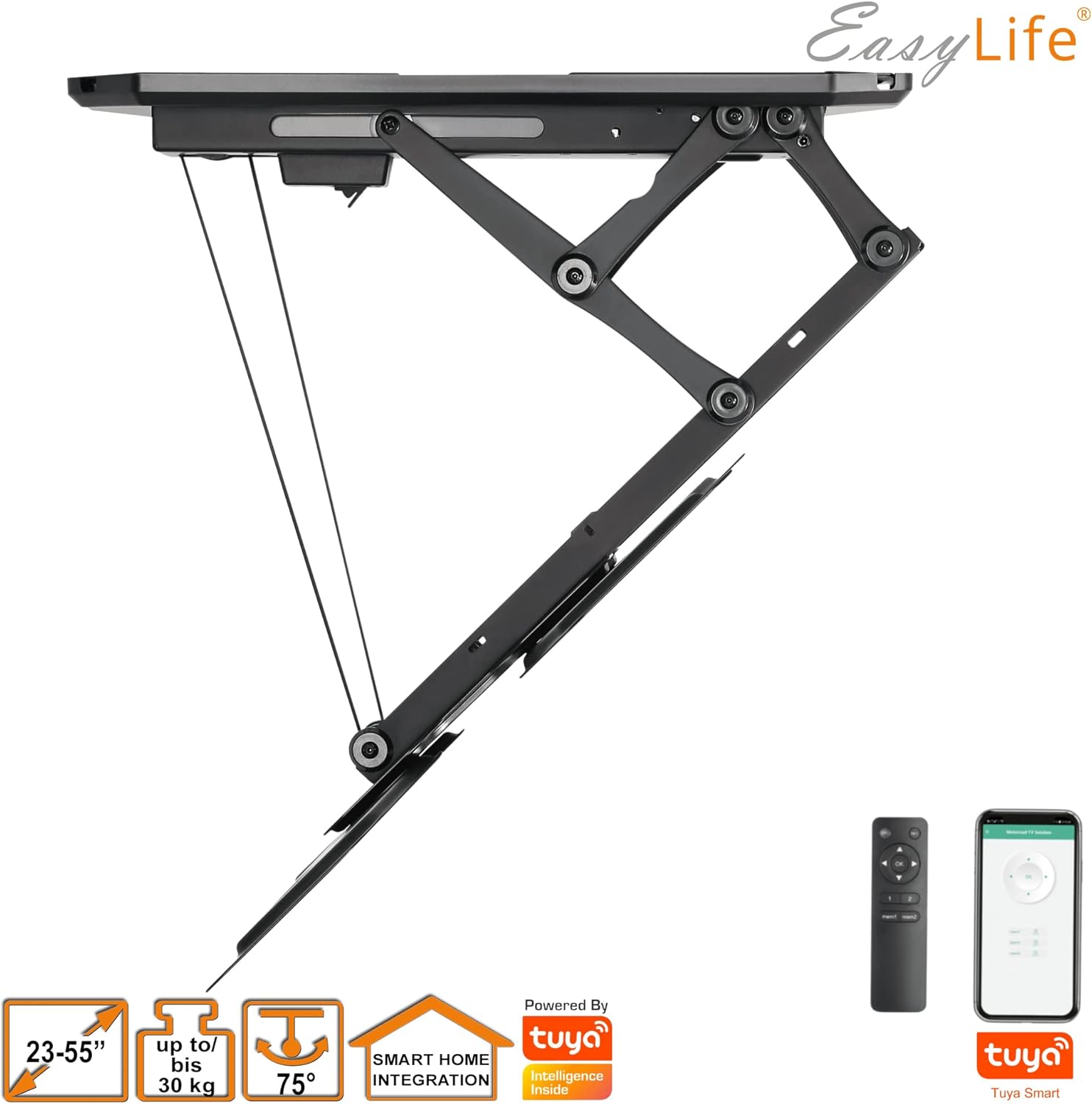 - ✅ LIEFERUMFANG: 1x EasyLife EL-DHM-55S TV Deckenhalterung schwenkbar in Schwarz für TV's von 23 bis 55 Zoll (58 bis 140 cm), mit elektrischem Motor und Smart Home Integration, 1x Fernbedienung, 1x Befestigungsmaterial für die Deckenmontage inklusive