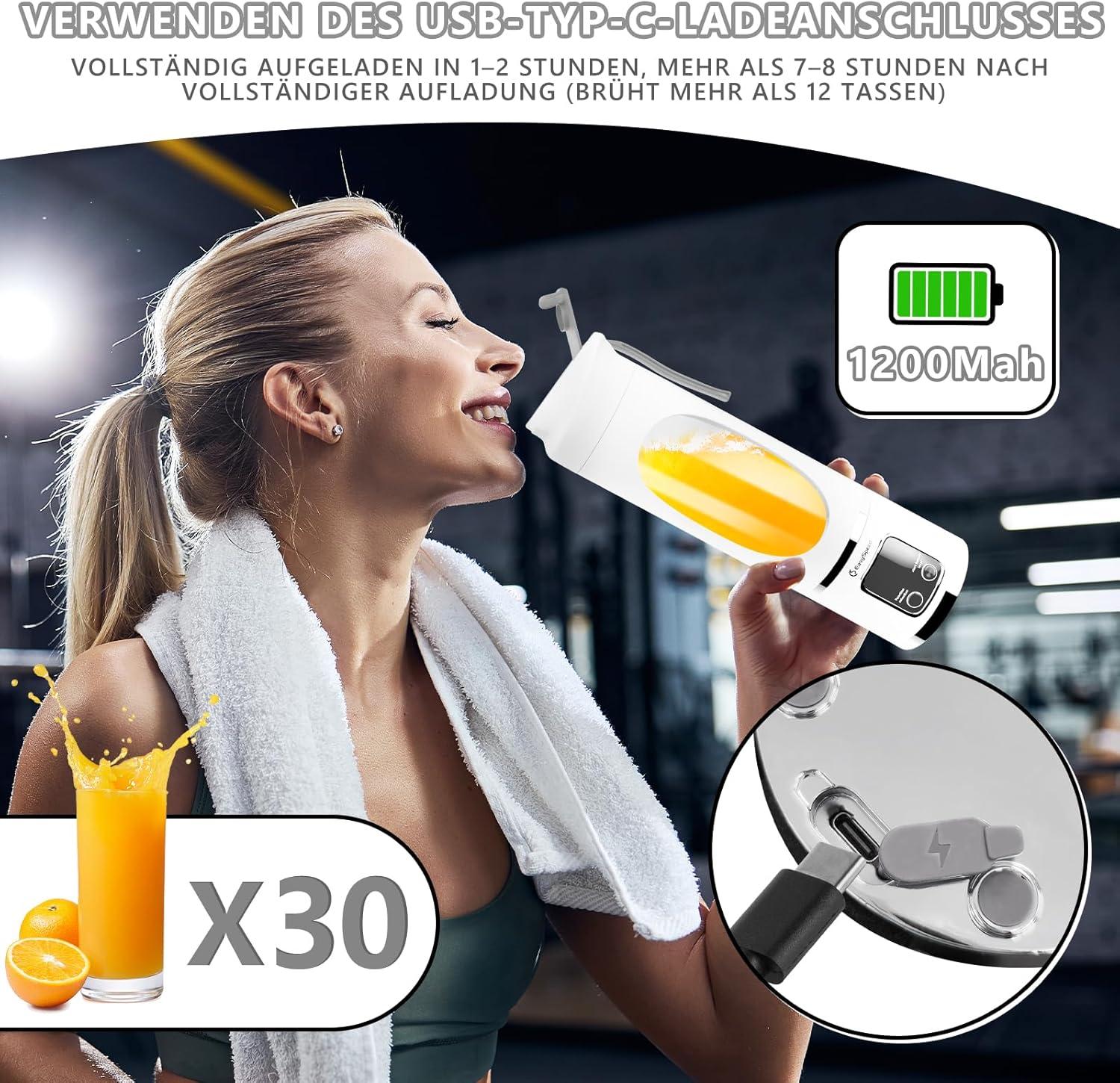 - Lange Akkulaufzeit: Dieser Mini-Entsafter verfügt über einen integrierten 1200-mAh-Akku und eine Typ-C-Ladeschnittstelle. Er kann mit einem Netzteil, einem Laptop, einem mobilen Ladegerät oder einem Kfz-Ladegerät aufgeladen werden. Dieser pa1ra