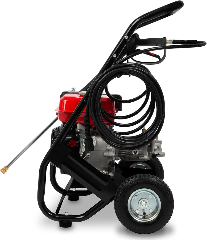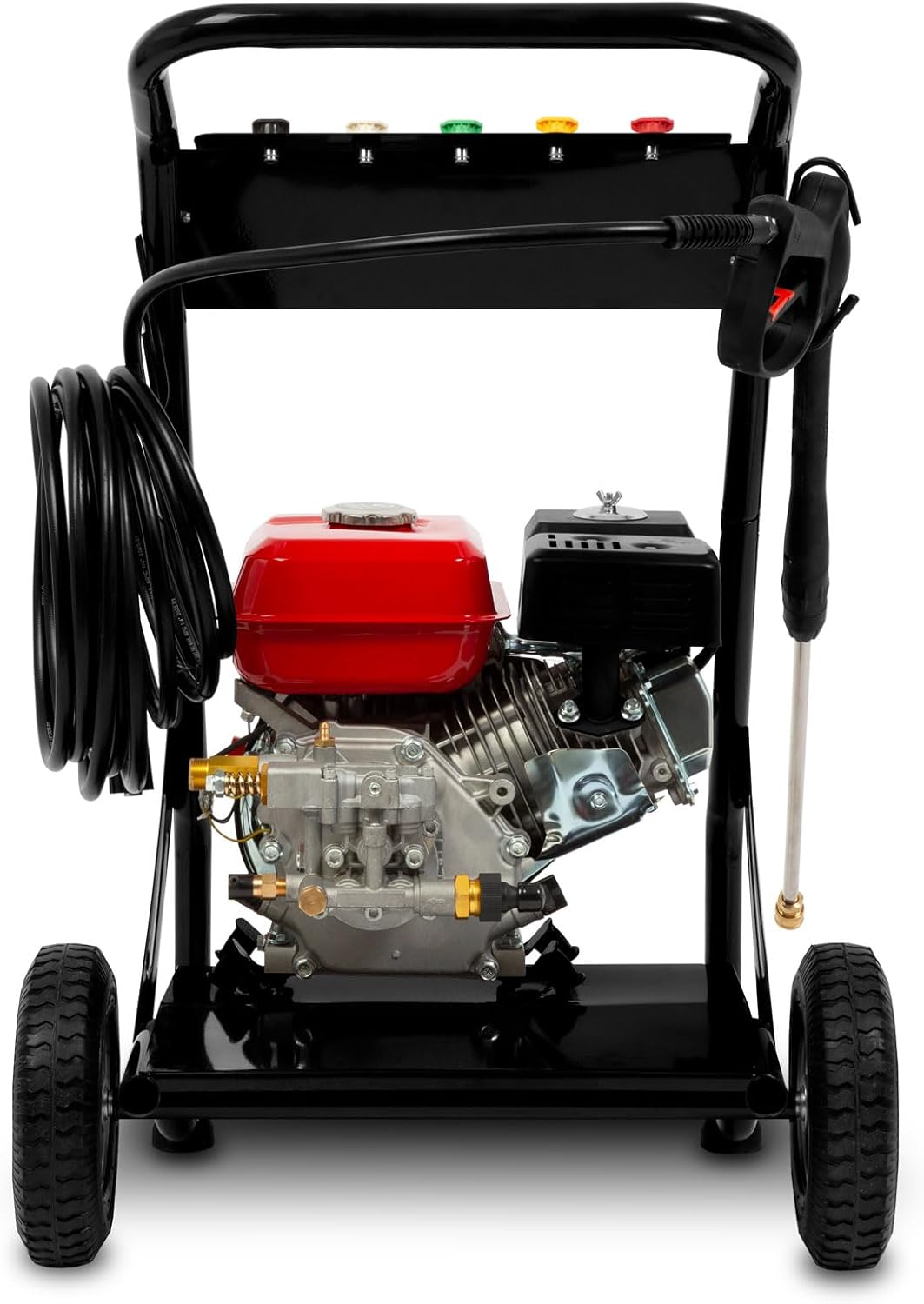 - POWER: Der Hochdruckreiniger hat einen Arbeitsdruck von 210 bar. 5 verschiedene Hochdruck-Düsen sind inklusive und für hohen Komfort sind robuste Räder und ein 5 Meter langer Schlauch an der Hochdruckpistole vorhanden. Der Kraftstofftank ist 3,6 L