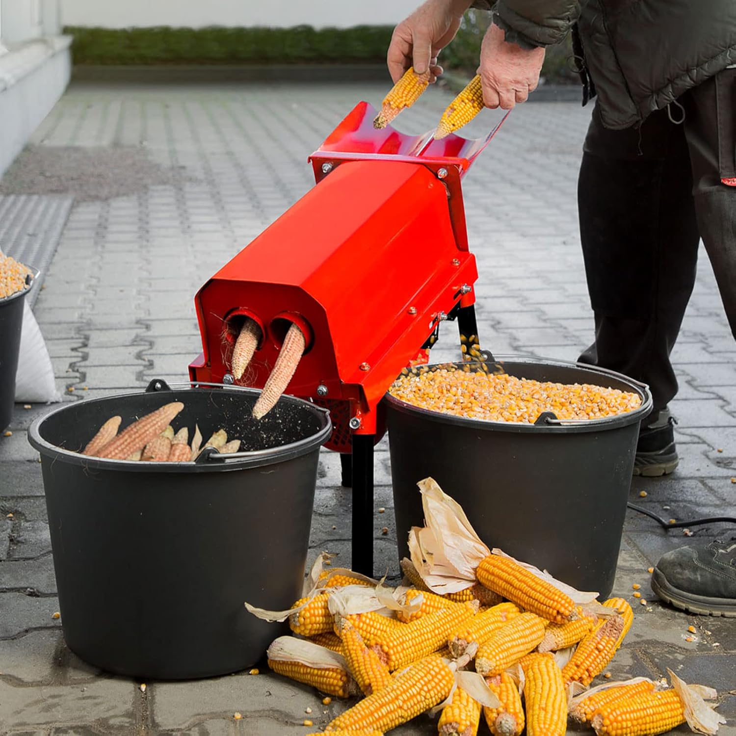 - UNTERGESTELL: Der praktische Unterbau erhöht die elektrische Mais Entkörnungsmaschine. Dadurch können Maiskolben im Stehen eingefüllt und unter den Auswürfen Auffangbehälter platziert werden. Es gibt zwei Auswürfe, einen für die Maiskörner und