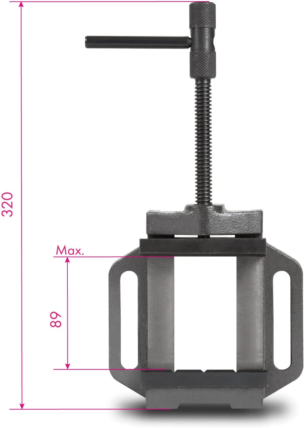 - Die maximale Spannbreite des Maschinenschraubstocks beträgt 89 mm. Mit der Stahltrapezspindel können Werkstücke schnell ein- und ausgespannt werden. Über zwei Öffnungen in der Bodenplatte (jeweils 14 x 80 mm gross) kann der Maschinenschraubstock auf