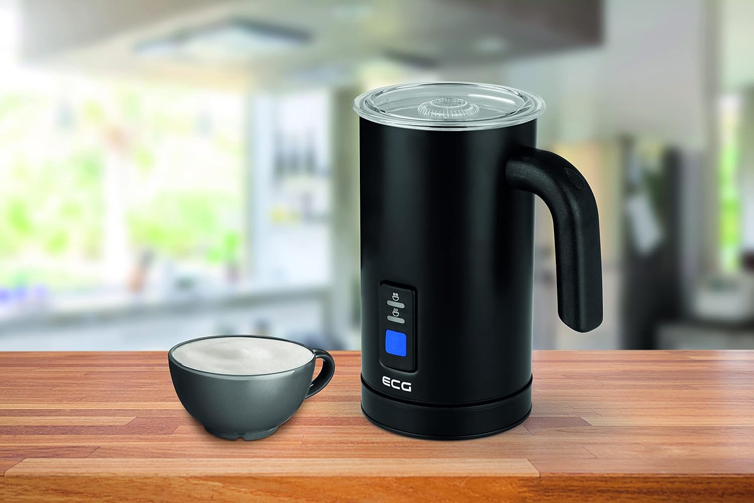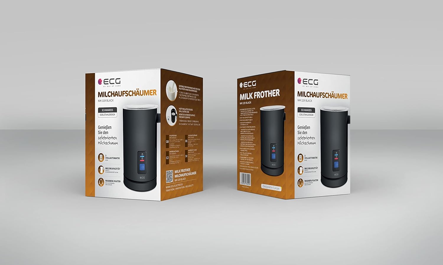 - Der Milchaufschäumer von ECG kann bis zu 115 ml Milch aufschlagen und bis zu 240 ml Milch erhitzen. Dank der zusätzlichen Leistung erhitzt er Milch in nur 130 Sekunden auf eine maximale Temperatur von 65 °C. Wenn das Aufschlagen und Erhitzen zugleich