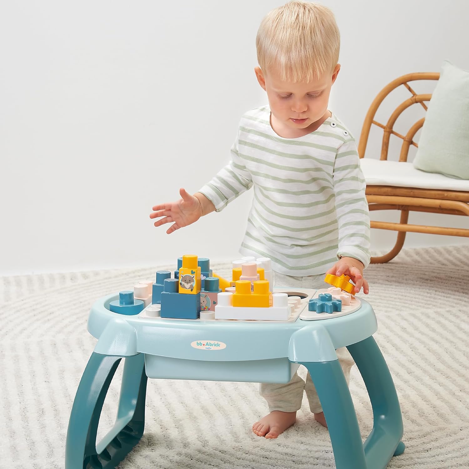 - Auf dem Tisch: Dieses Set enthält 1 Krabbeltisch mit 15 Ziegeln, 4 Formen, 3 Zahnräder und Aufbewahrungsmöglichkeiten.