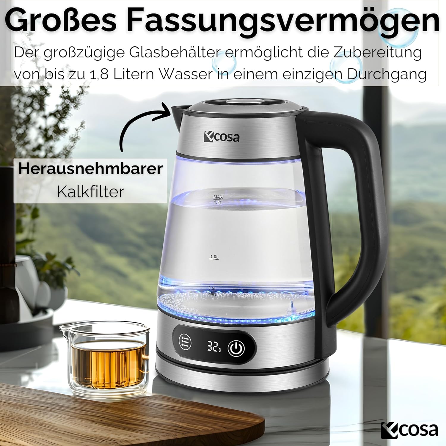 - ◾Grosses Fassungsvermögen von 1,8 Litern◾ Der grosszügige Glasbehälter ermöglicht die Zubereitung von bis zu 1,8 Litern Wasser in einem einzigen Durchgang – ideal für Familien, Meetings, Teerunden oder Vieltrinker. So sparen Sie Zeit und