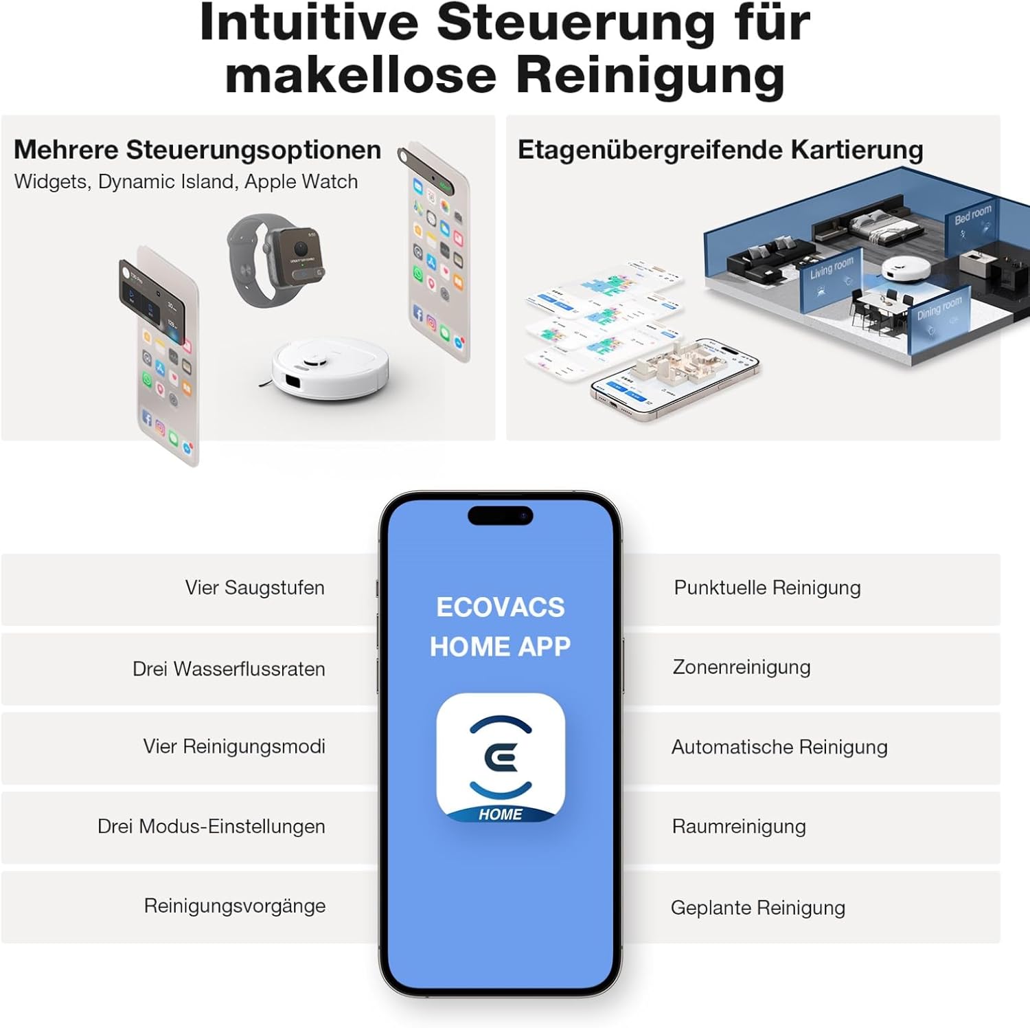 - 【Intelligente Steuerung】 DEEBOT N30 PRO OMNI bietet ein nahtloses Reinigungserlebnis mit der ECOVACS HOME App und bietet anpassbare Reinigungseinstellungen, einschliesslich Saugkraftanpassung, Wasserdurchflussregulierung sowie verschiedene