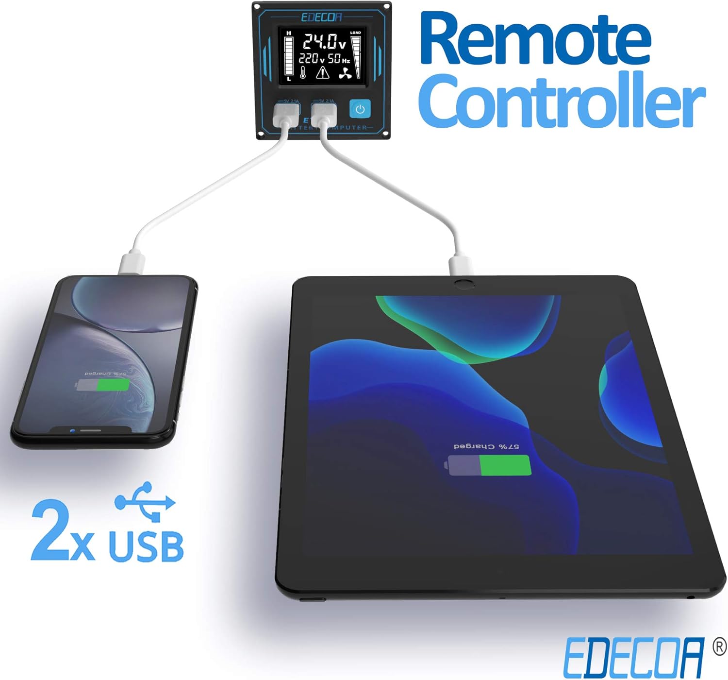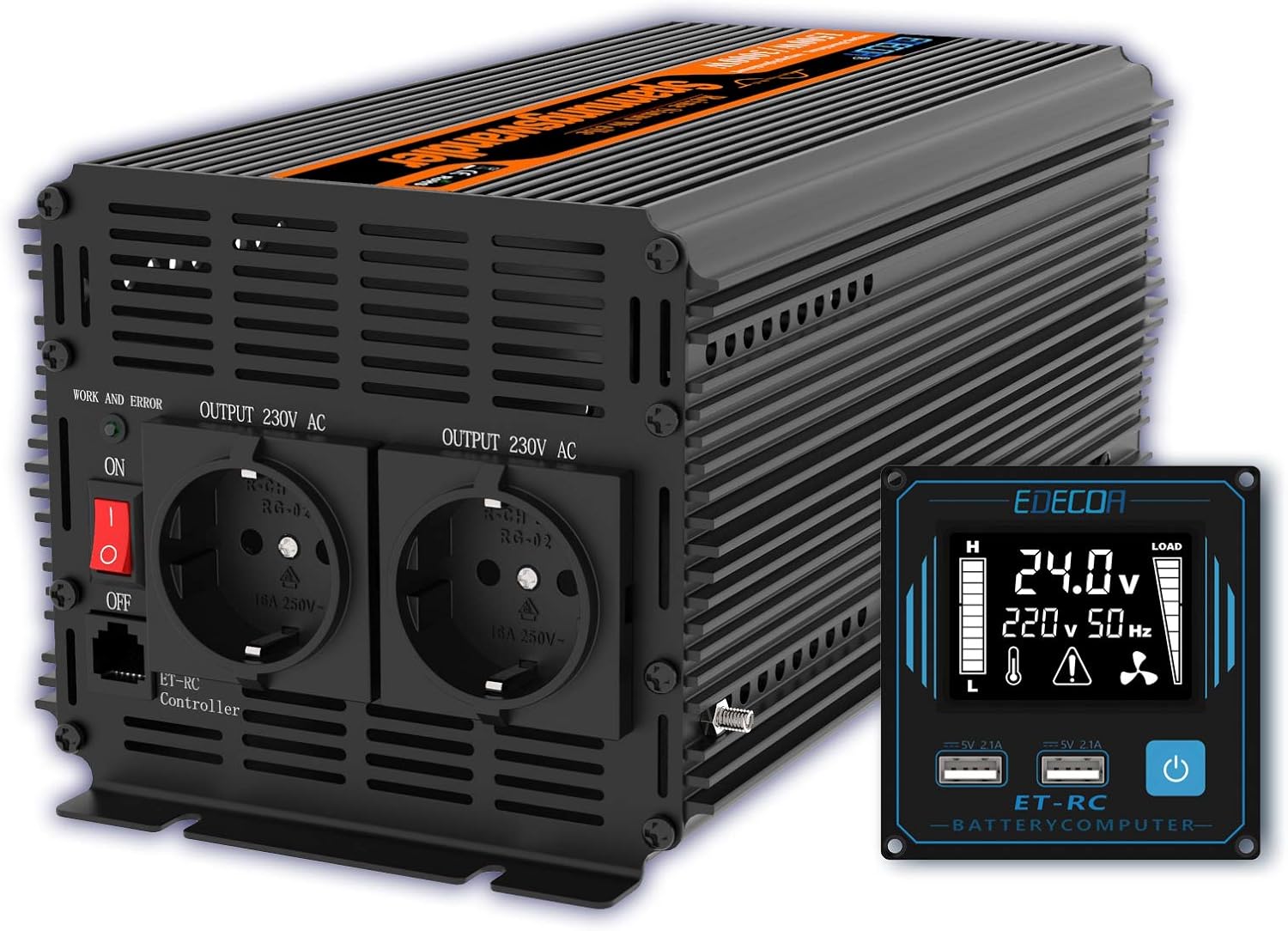 - Der Pure Wave Inverter wandelt die Eingangsspannung von 24V (Gleichstrom) in einen Ausgang von 220v / 230v (Wechselstrom) um. Dieser 1500 W Pure Wave-Transformator enthält eine Fernbedienung, an die Sie USB-Anschlüsse mit 5v / 2,1 anschliessen und den