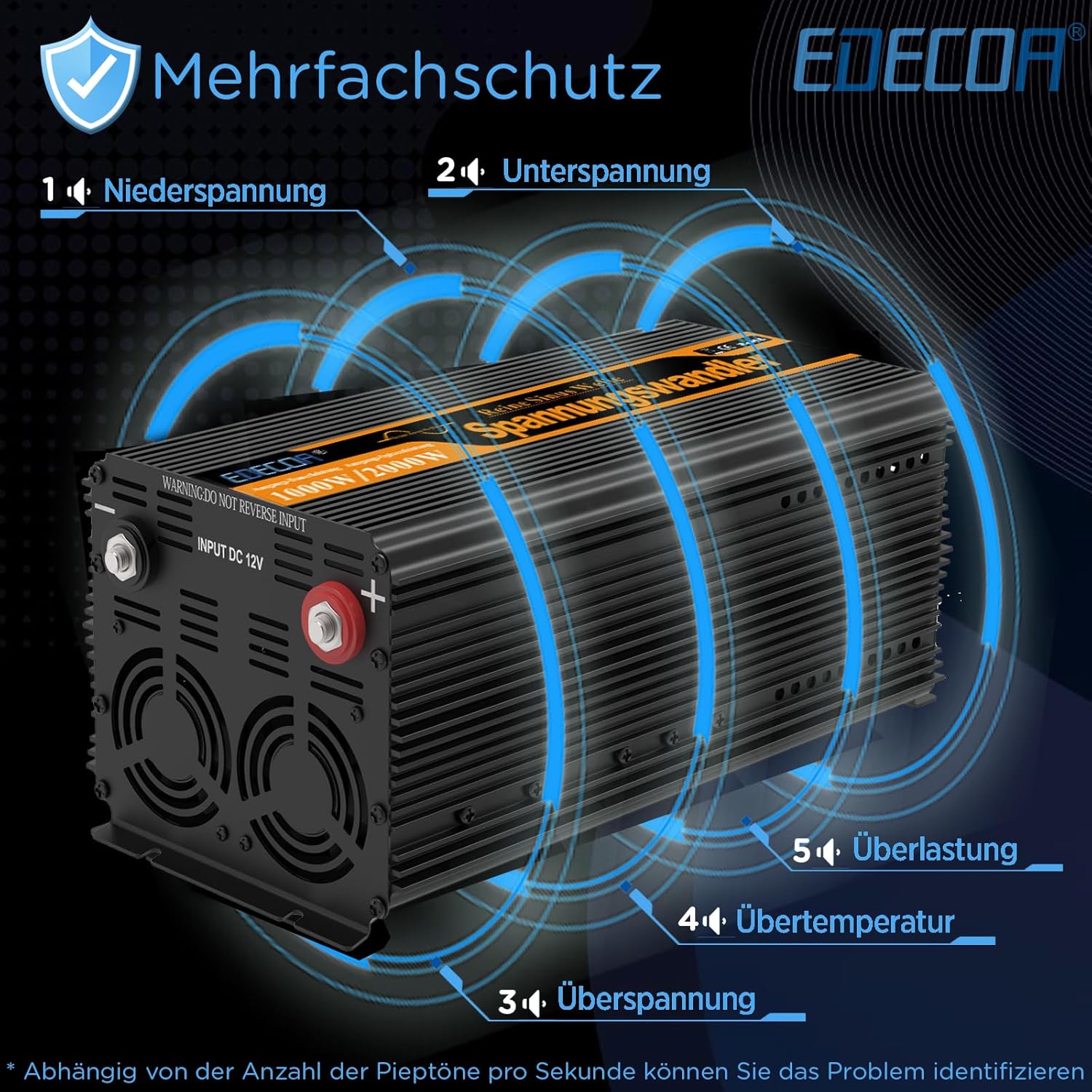 - Hochtechnologie: Der 12v 230v Spannungswandler verfügt über das SPWM-System, das Wechselrichterunterbrechungen, das Softstart-System und den automatischen Start reduziert und die Wiederherstellungszeiten verkürzt und optimiert. Der 1000w