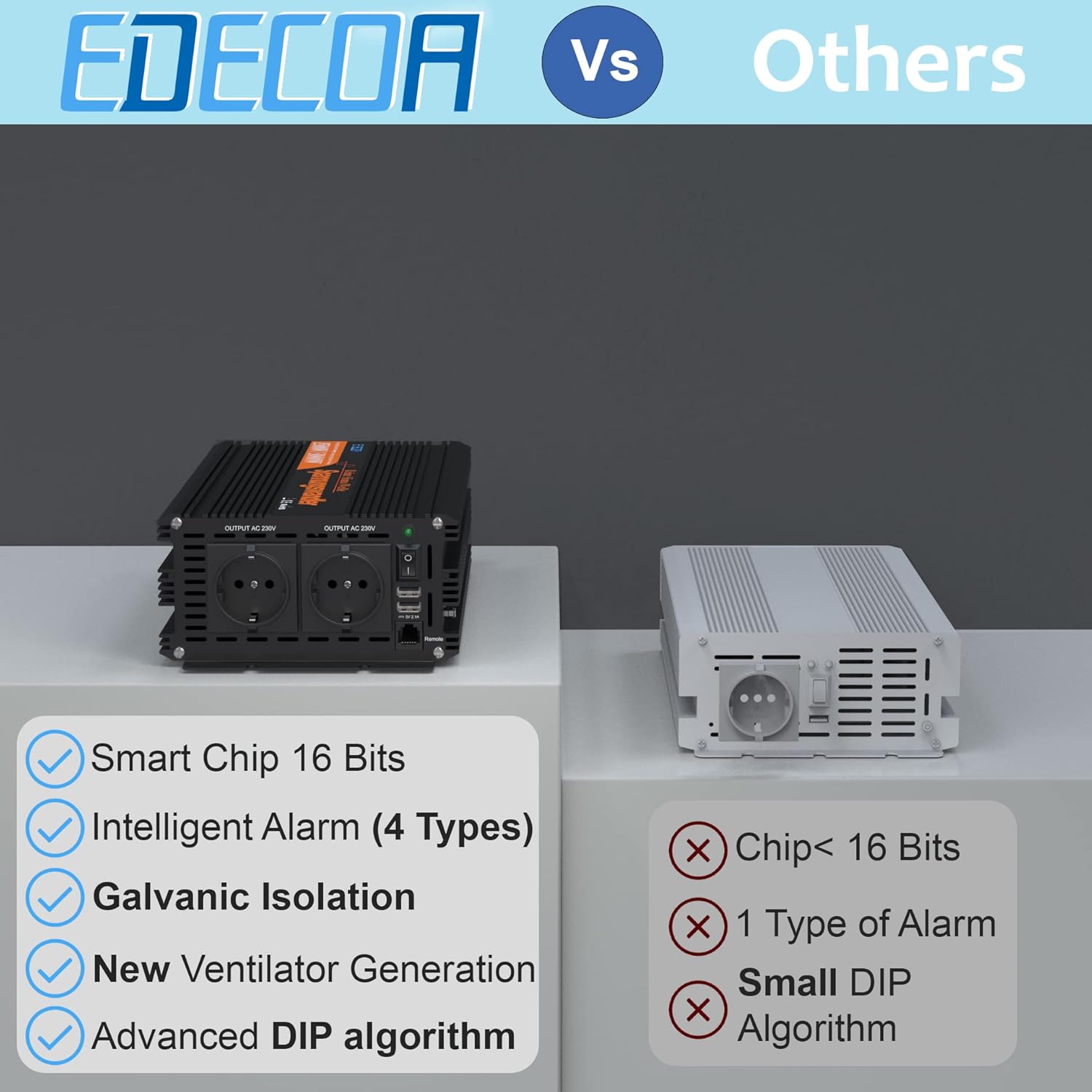 - MEHRFACHSCHUTZ: Schutz gegen Niederspannung, Überspannung, Übertemperatur, Überlastung und Überspannung. Die Spannungsregelung erfolgt automatisch (AVR) und verfügt über ein intelligentes Power Management (IPM). Wenn der Wechselrichter in den