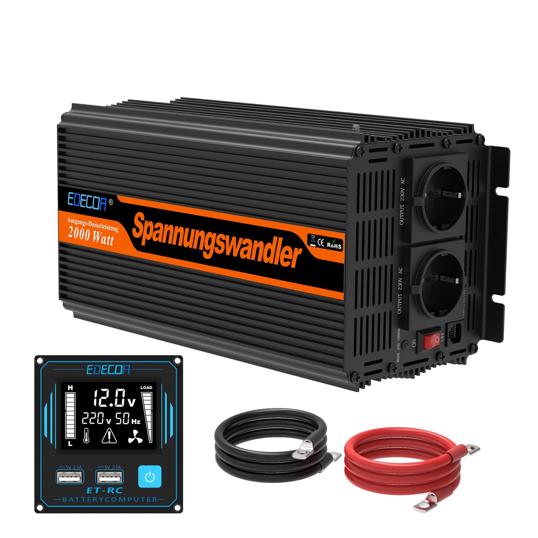 - Wechselrichter 2000w Dauerleistung und die momentane Spitze von 4000w, es dauert nur wenige Mikrosekunden, um die Leistungsspitzen zu absorbieren, die einige Geräte beim Arbeitsbeginn benötigen. Modifizierter Wellen- oder Rechteckwellenwandler mit zwei