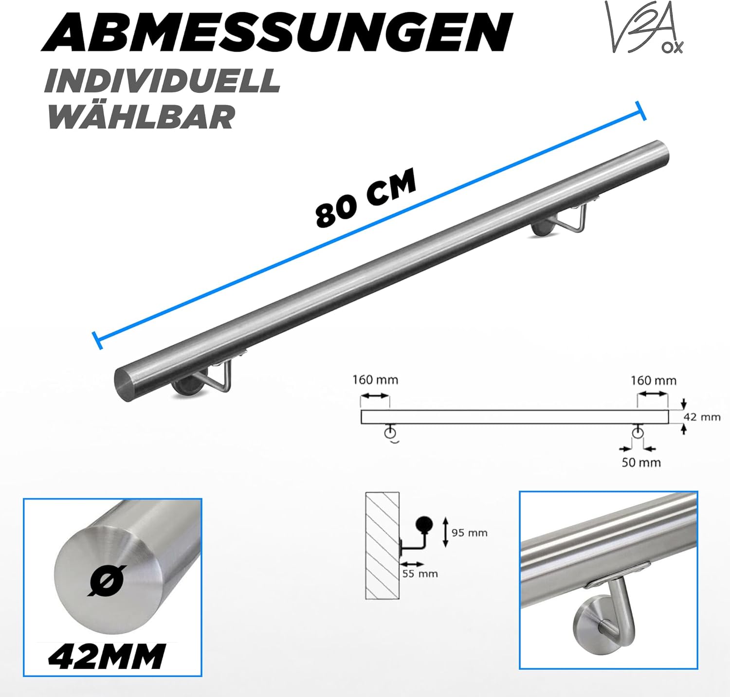 - Lieferumfang: 1 Handlauf und Halter (je nach Mengeauswahl mehr), Montagematerial, zusätzlich für Längen ab 250 cm : Verbindungsstück/e und Endkappen
