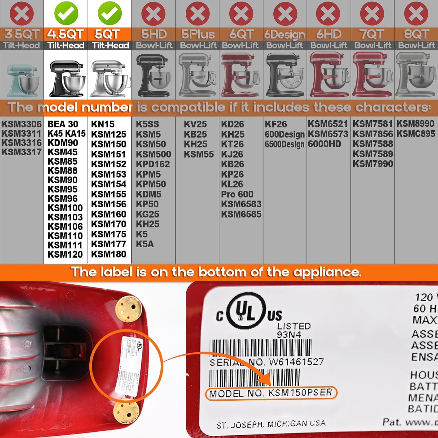 - Für 4. 5-5 Quart Tilt Head Mixer - Kompatibel mit Kitchen Aid K45 K45SS K45WW KN15E1X, KSM75, KSM85PS, KSM88PSQ, KSM90, KSM95, KSM96, KSM97, KSM100, KSM103, KSM105, KSM110, KSM120, KSM150, KSM150A, KSM151PS, KSM152, KSM153, KSM154, KSM155, KSM156HB,