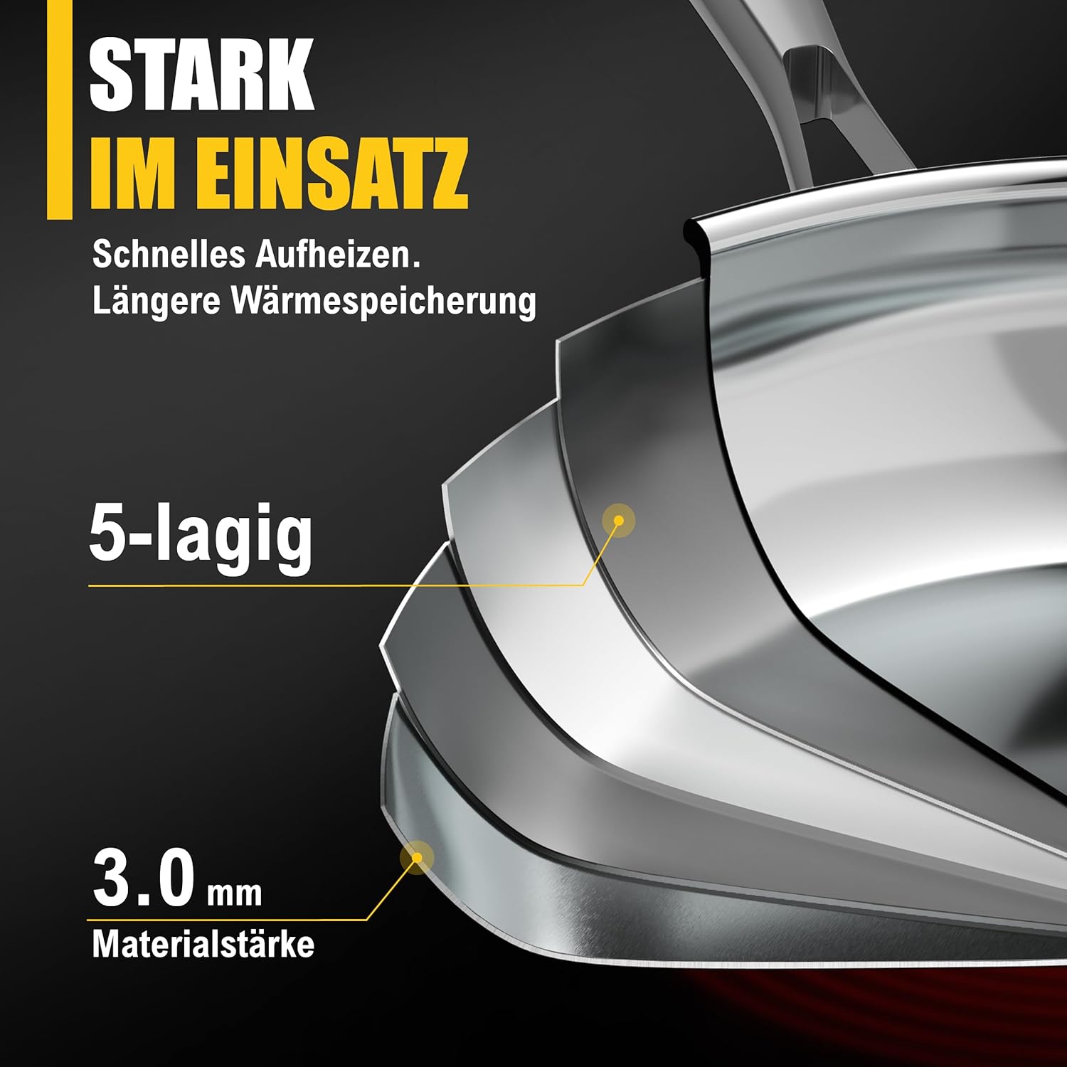 - HERD: Induktion, Gas, Elektro, Ceran & Backofen ( MAX 400°C) - Masse: Ø 24 cm, Länge 46 cm, Höhe 5 cm mit 5 Schichten und einer Gesamtstärke von 3 mm