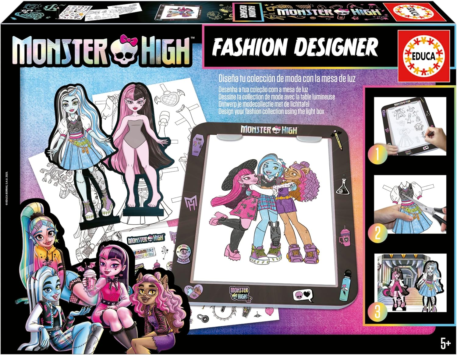 - Erstellen Sie Ihre Barbie-Zeichnungen, indem Sie sie mit dem Leuchttisch abziehen; färben Sie sie aus und personalisieren Sie sie mit den Aufklebern, fordern Sie Ihre Looks mit Barbie-Figuren auf dem Laufsteg der Modeherausforderung heraus