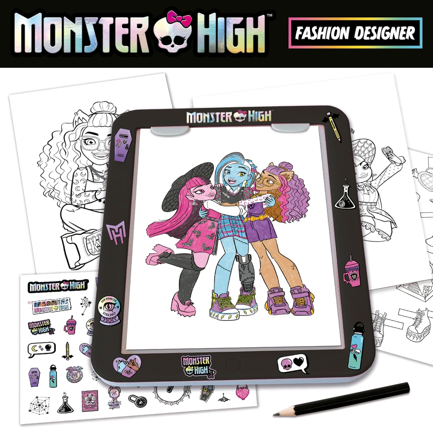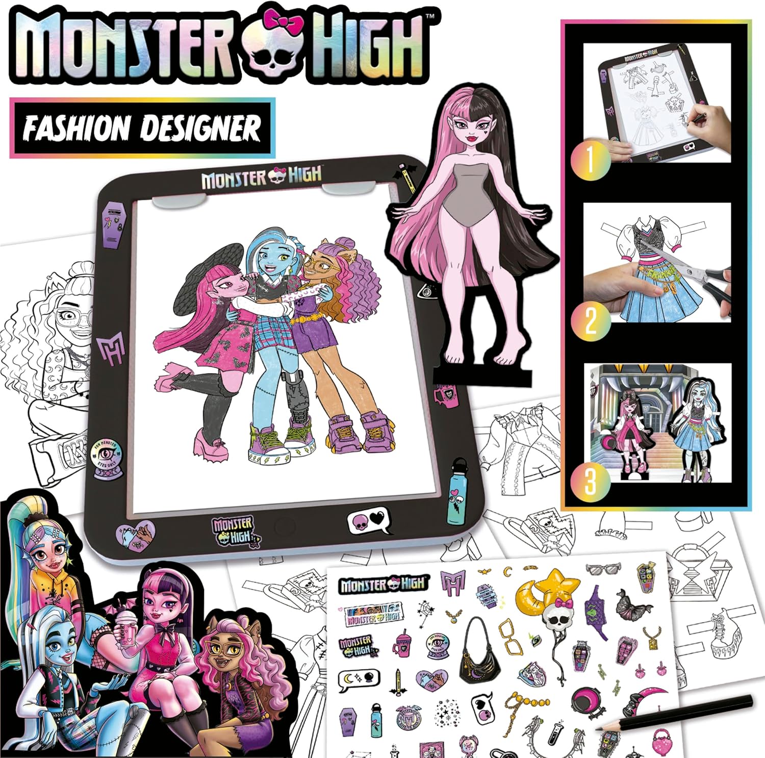 - Monster High Fashion Designer-Workshop; Kombinationsmöglichkeiten zum Herausfallen oder von Outfits und Aufklebern zum Neupositionieren