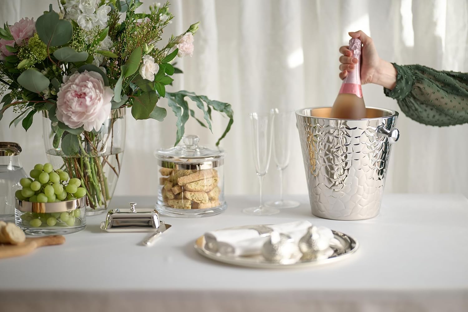 - ✔ 𝗦𝗧𝗜𝗟𝗩𝗢𝗟𝗟𝗘𝗦 𝗗𝗘𝗦𝗜𝗚𝗡: Mit der gehämmerten Silber-Optik setzt der Weinkühler Capri von EDZARD ein stilvolles Statement. Die Spiegelglanz-Politur und die Innenseite mit Silber-Optik sowie der elegante Ständer komplettieren das noble Design.