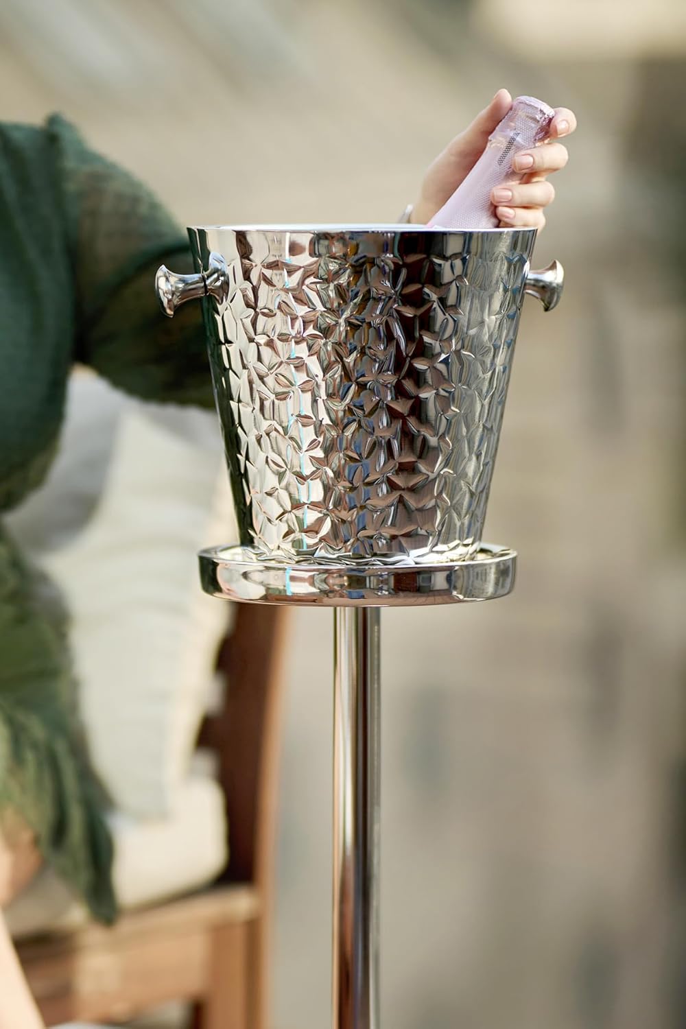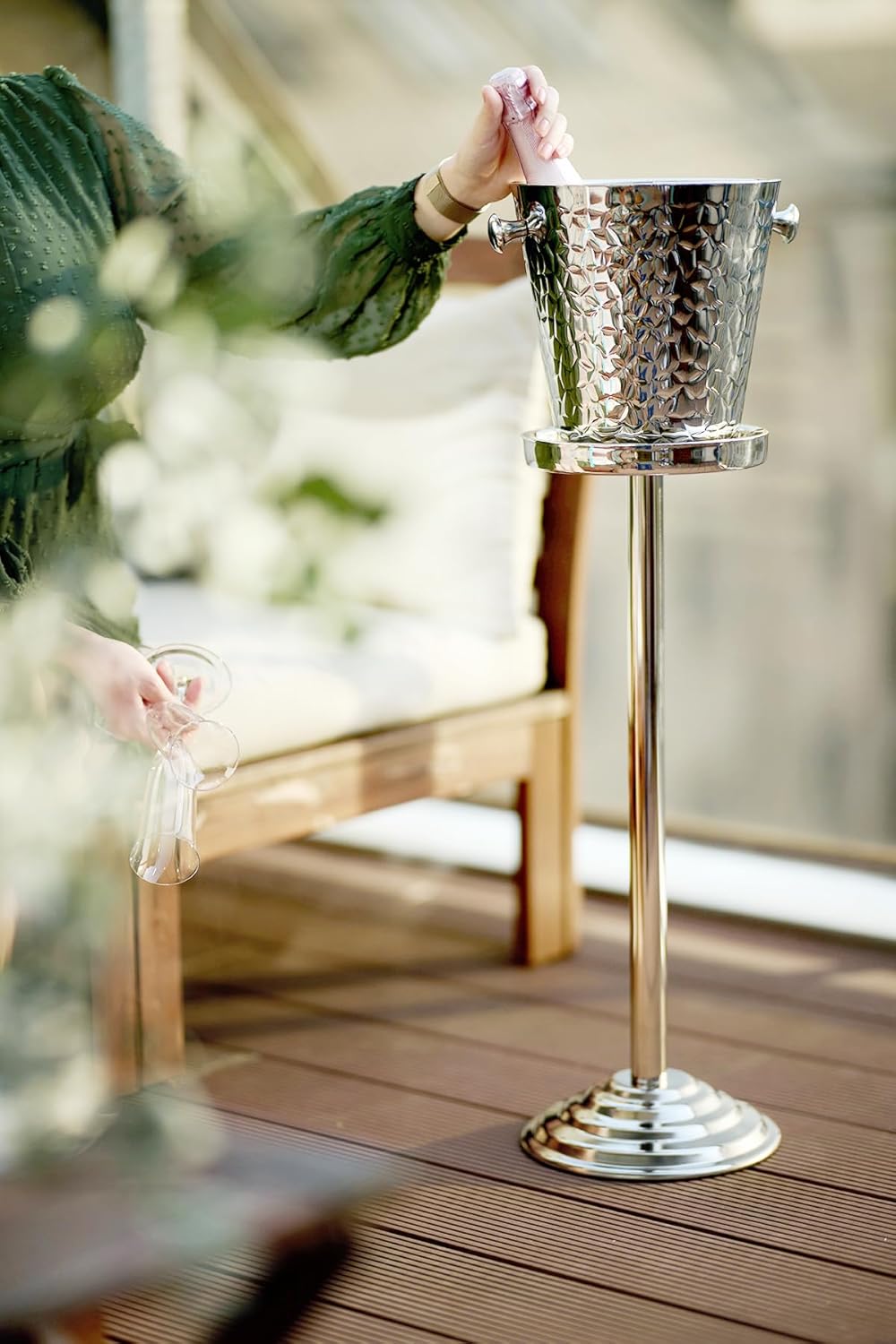 - ✔ 𝗩𝗢𝗥𝗧𝗘𝗜𝗟𝗘: Edelstahl mit gehämmerter Silber-Optik | Silber-Optik innen | Hochglanzpoliert | Seitliche Tragegriffe | Doppelwandig | Bis zu 10 h Kühlung | Auch als Dekoschale | Höhe des Kübels 23 cm | Ø 22 cm | Höhe des Ständers 62 cm