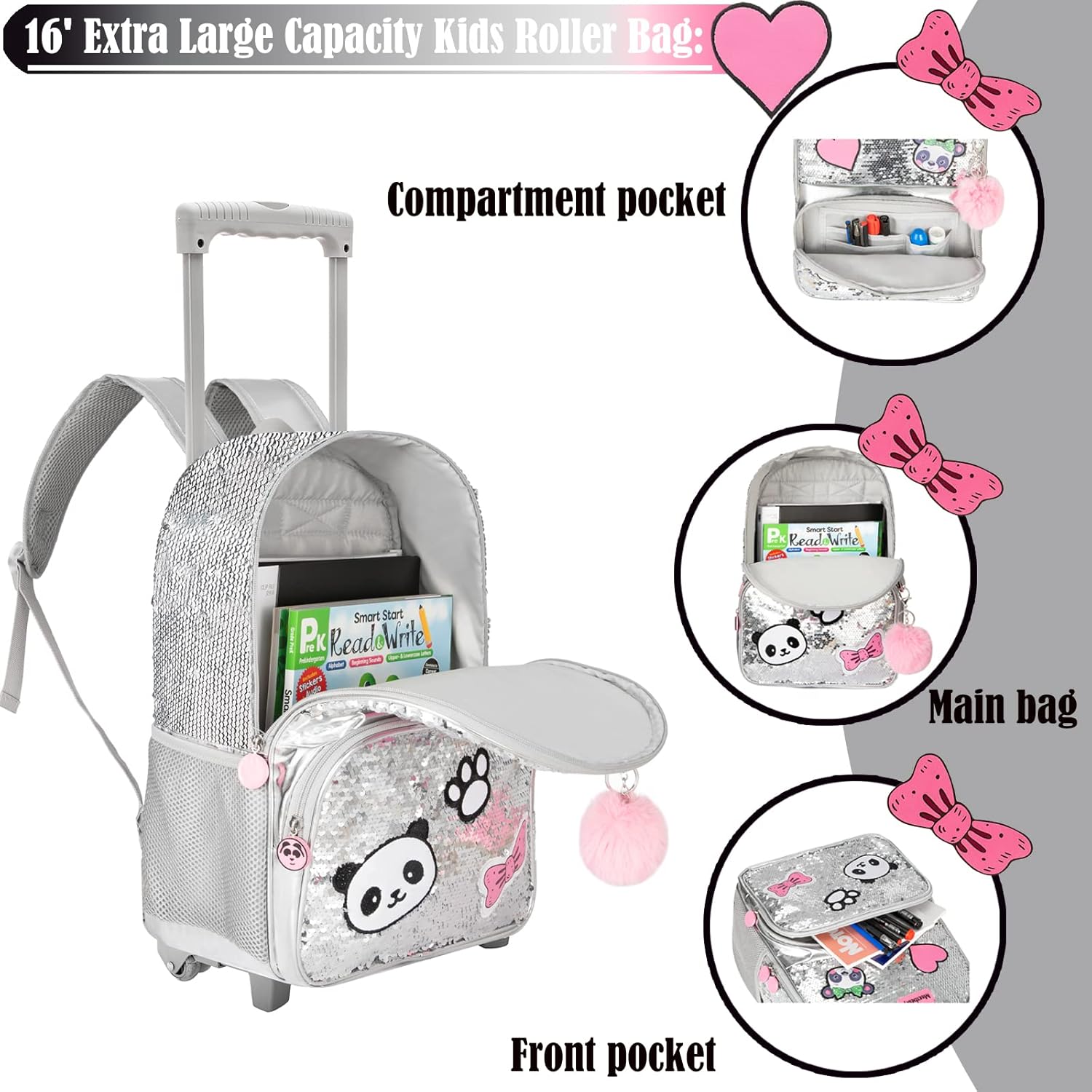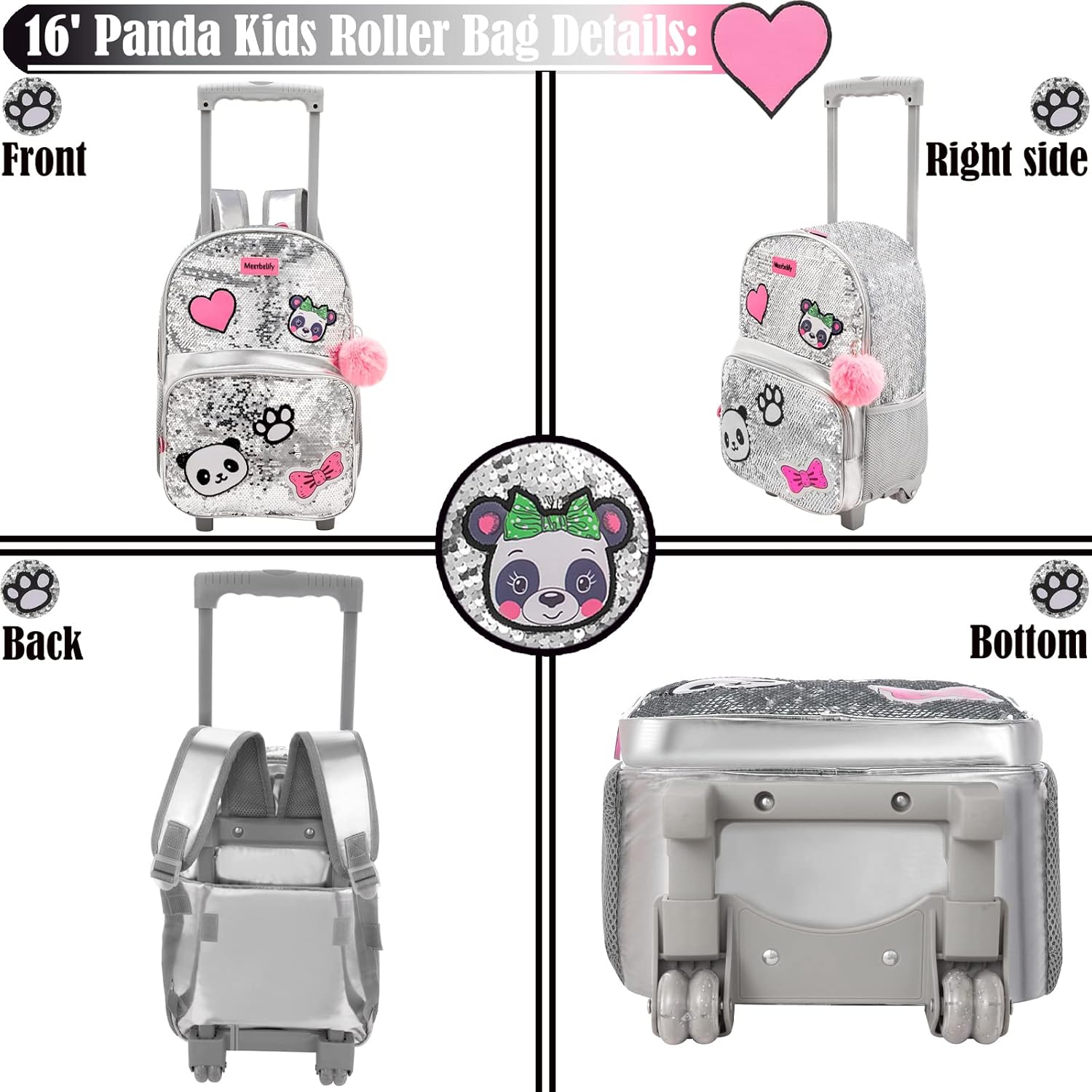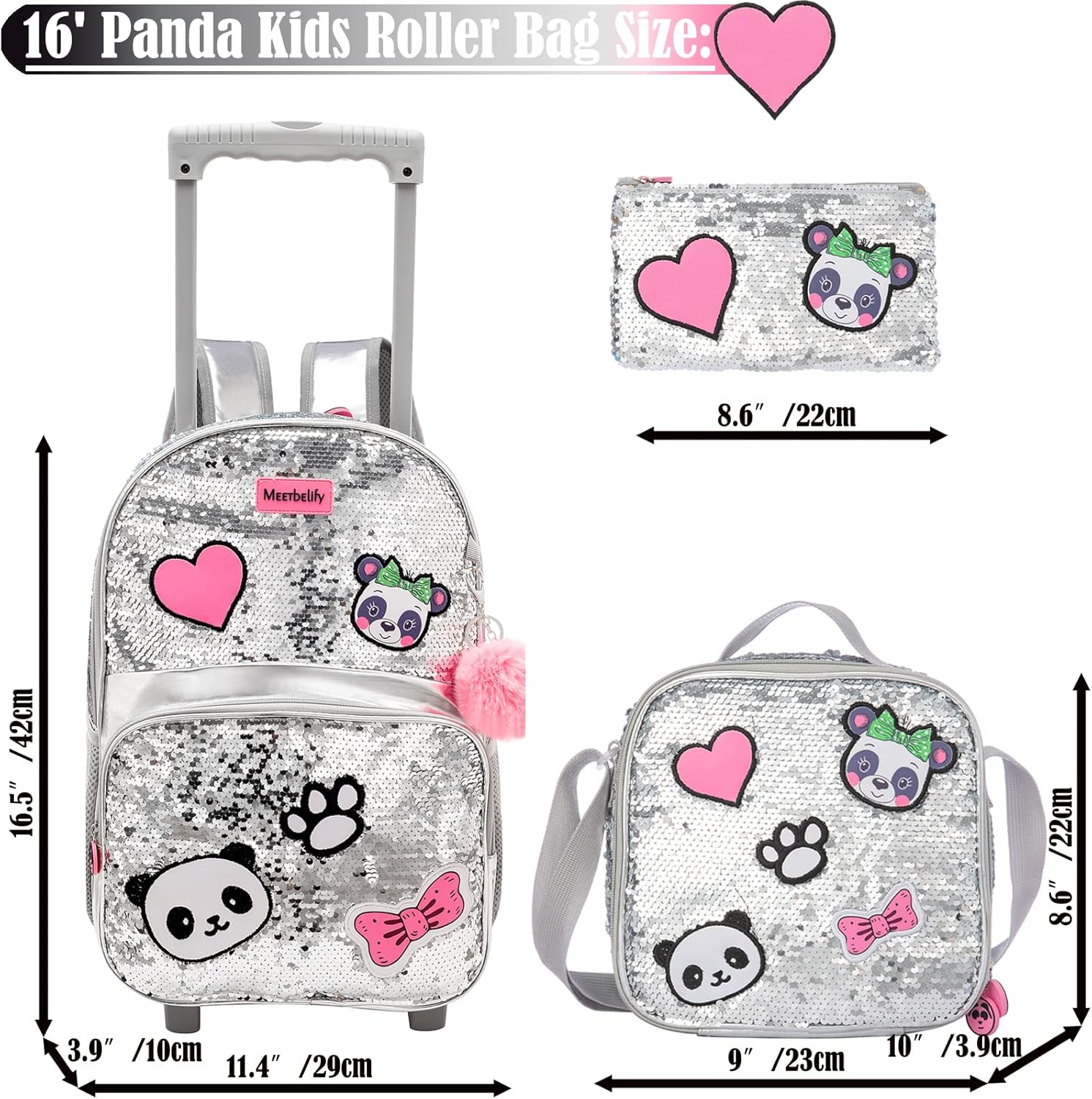 - 📚【Rollender Schulrucksack für Kinder】 3PCS 16”Panda-Trolley-Rucksack mit silbernen Pailletten für Mädchen : - 1 PCS Trolley-Rucksack (H: 42 cm x L: 33 cm x B: 30 cm) - 1 PCS Mäppchen (L: 24.9CM) - 1 PCS Lunchpaket (H: 20 cm x L: 23cm x B: