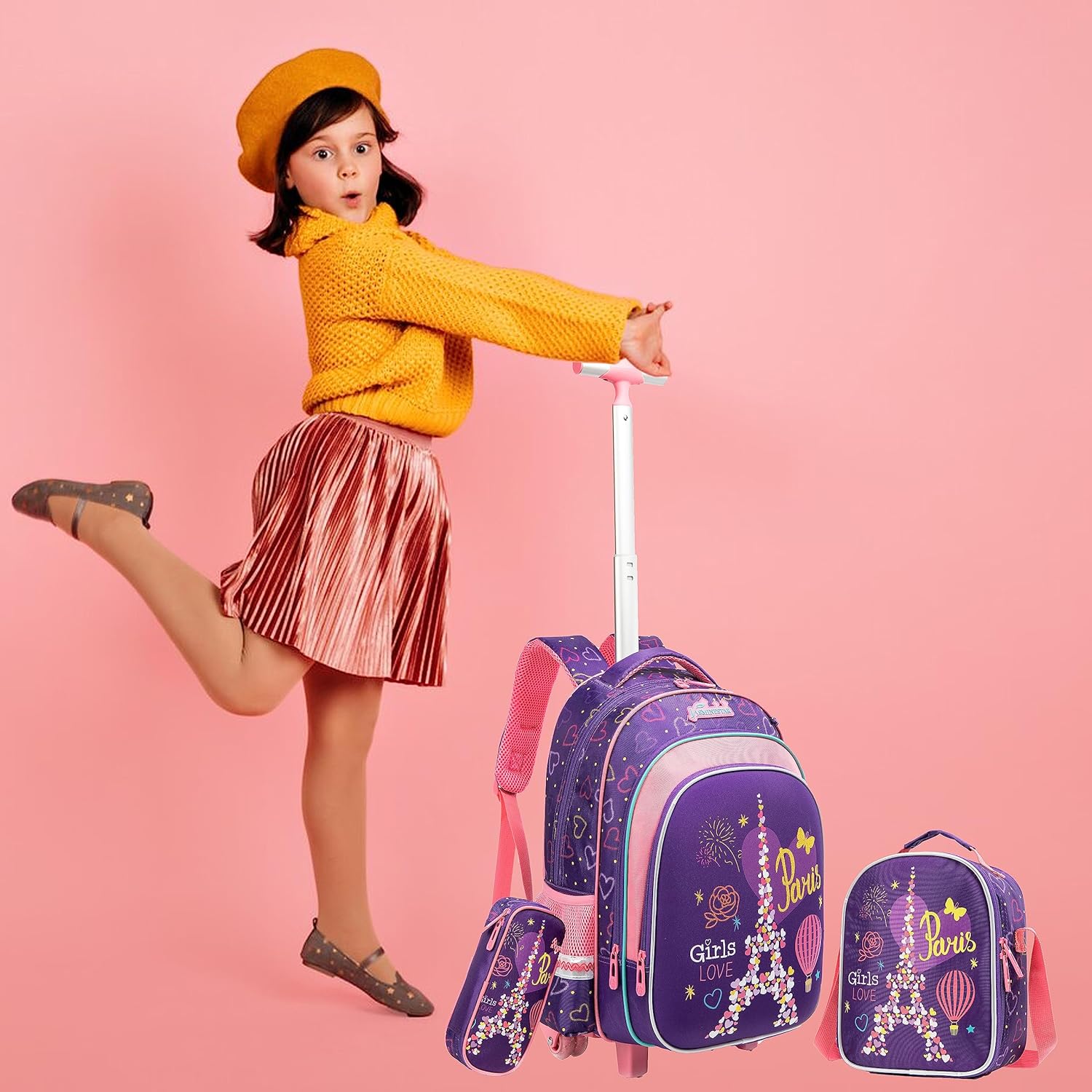 Egchescebo Schulranzen Kinder Rollrucksack für Mädchen 17" 3PCS Rollen Reiserucksäcke Lila-4, Lila-4