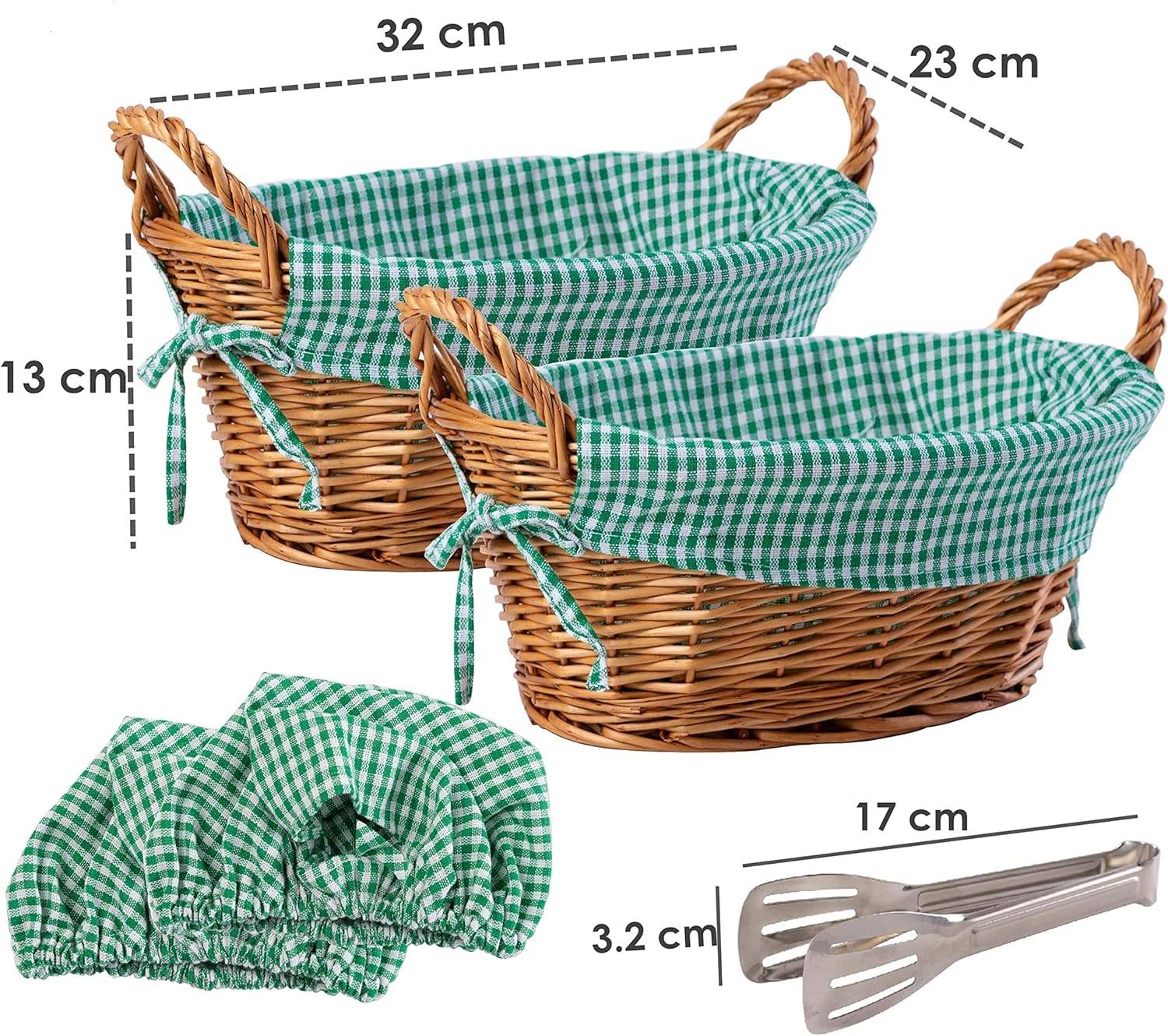 - 🥐 DEINE WAHL - Set aus 2 handgeflochtenen Brotkörben aus Naturweide, 2 herausnehmbare Baumwollbezüge zum Auffangen von Krümeln, 2 atmungsaktiven Baumwollkorbbezügen + 1 Brotzange aus Edelstahl. Masse des Korbes: 32x23x13cm - für ca. 10 Brötchen.
