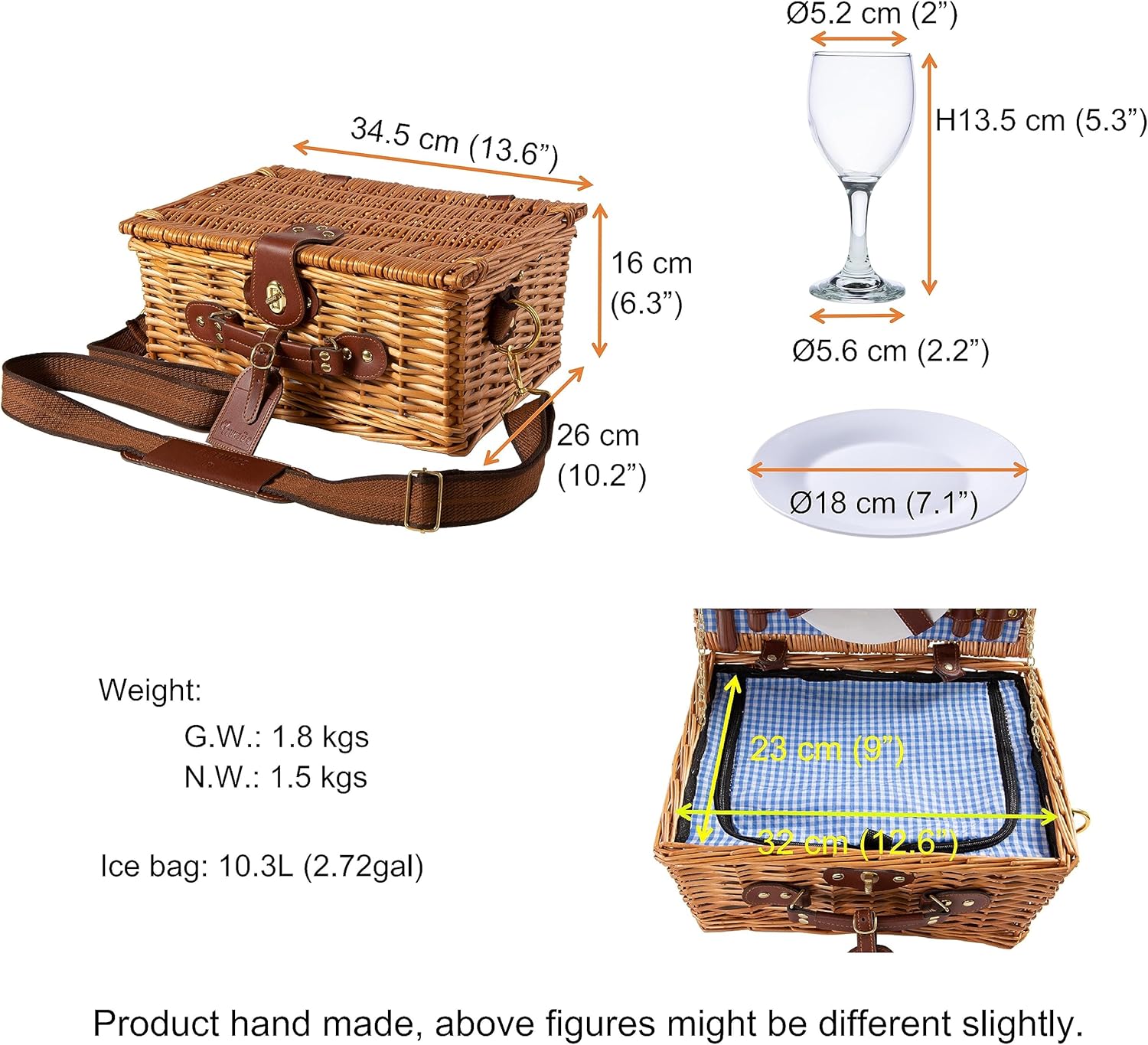 - 🥂 INHALT - 1 Picknickkorb für 2 Personen mit abnehmbarem Schultergurt, Kühlfach und Zubehör. Handgewebt aus Naturweide. Innen und aussen fest fixiert und mit transparentem Faden handgenäht. Stofffutter mit blauem Gingham-Muster.