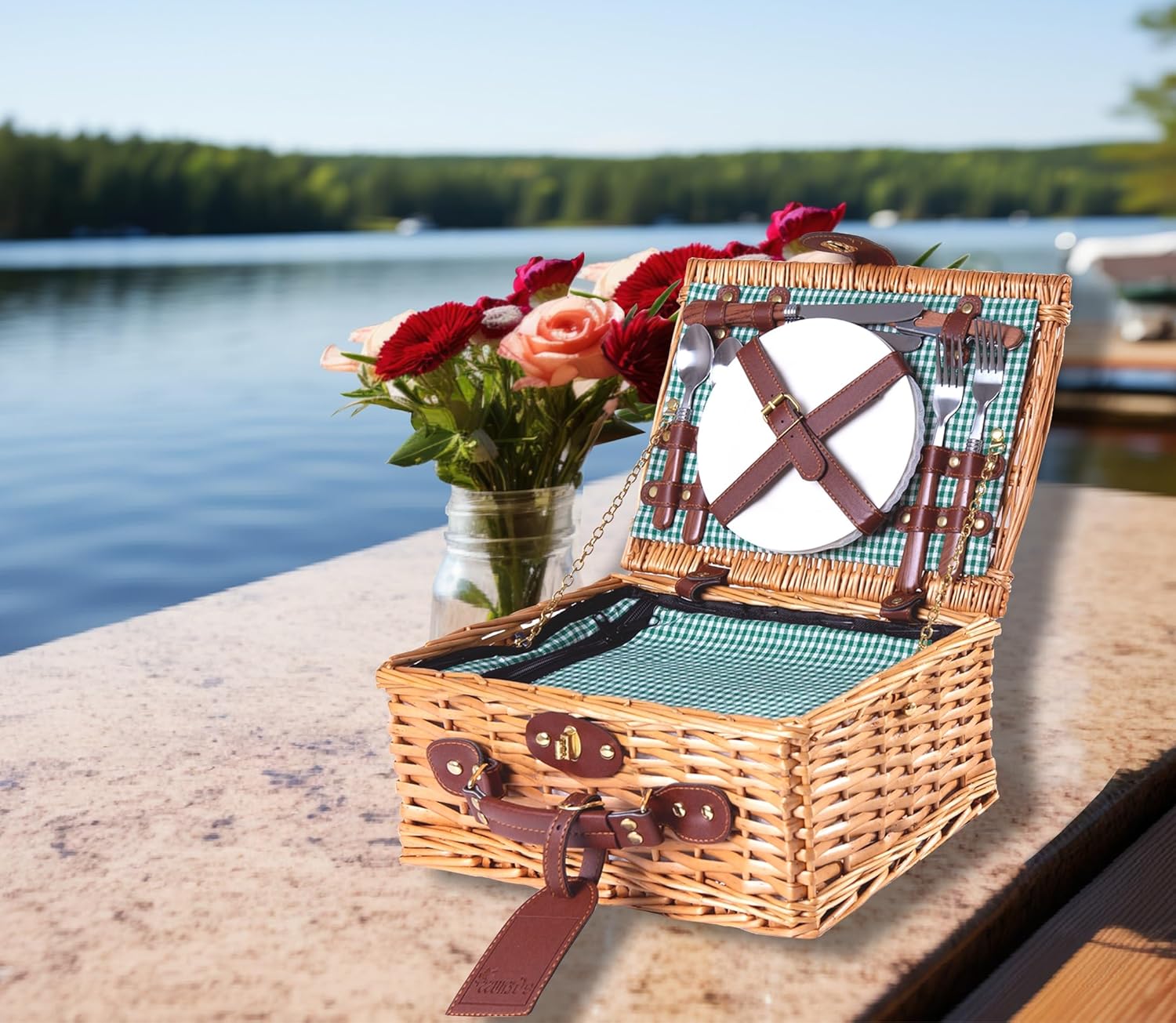 - 🥂 PICKNICKKORB - Der Korb, für 2 Personen, ist handgewebt aus Naturweide. Innen und aussen sicher befestigt und handgenäht mit transparentem Garn. Der Stoff hat ein 𝐠𝐫ü𝐧𝐞𝐬 Gingham-Muster.