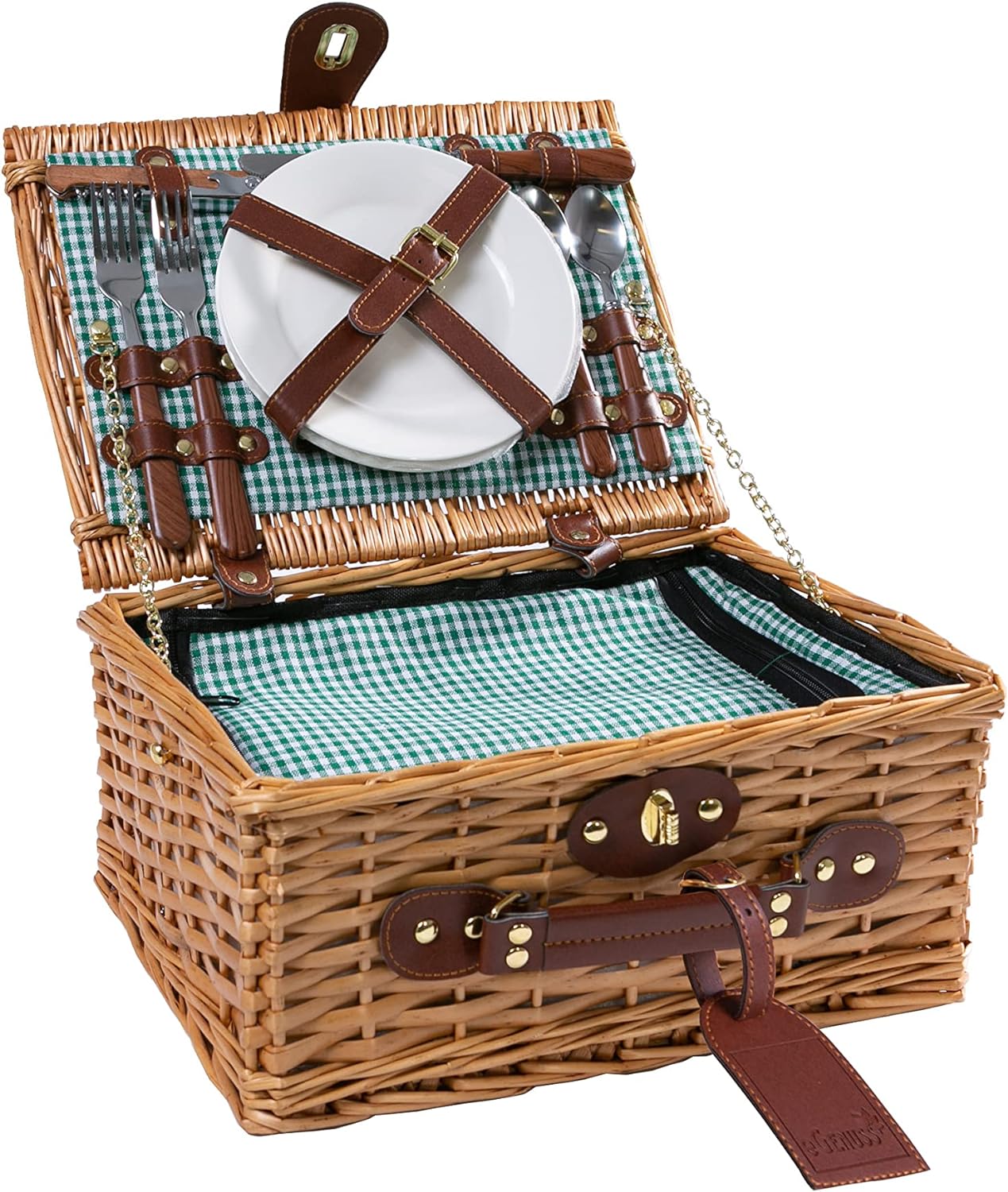 - 🥂 HOHE QUALITÄT - Der Korb ist innen mit Kunstlederriemen versehen und leicht zu tragen. Besteck aus Edelstahl, Besteckgriffe aus Kunststoff in Holzoptik, Teller aus Porzellan, Weingläser aus Echtglas, Multifunktionsmesser aus Echtholz.