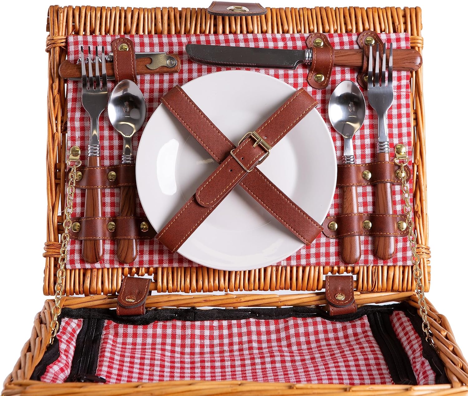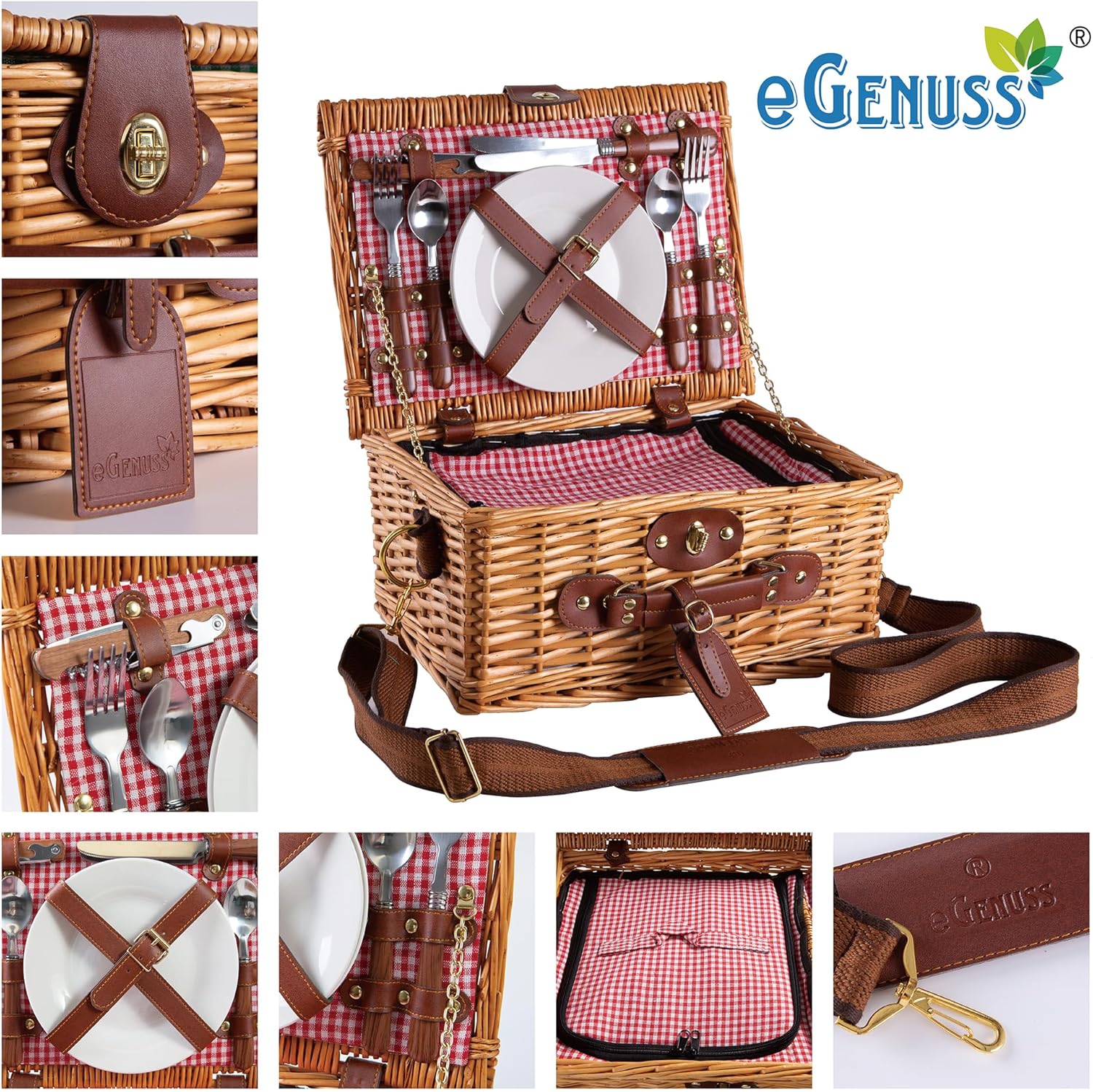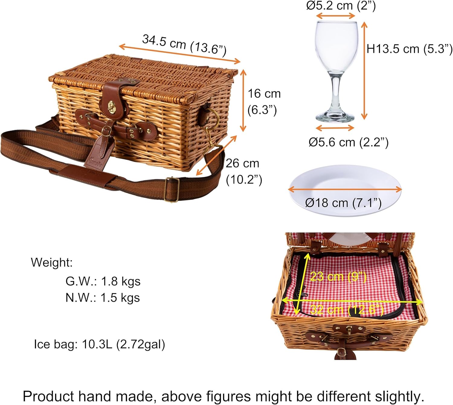 - 🥂 INHALT - 1 Picknickkorb für 2 Personen mit abnehmbarem Schultergurt, Kühlfach und Zubehör. Handgewebt aus Naturweide. Innen und aussen fest fixiert und mit transparentem Faden handgenäht. Stofffutter mit rotem Gingham-Muster.