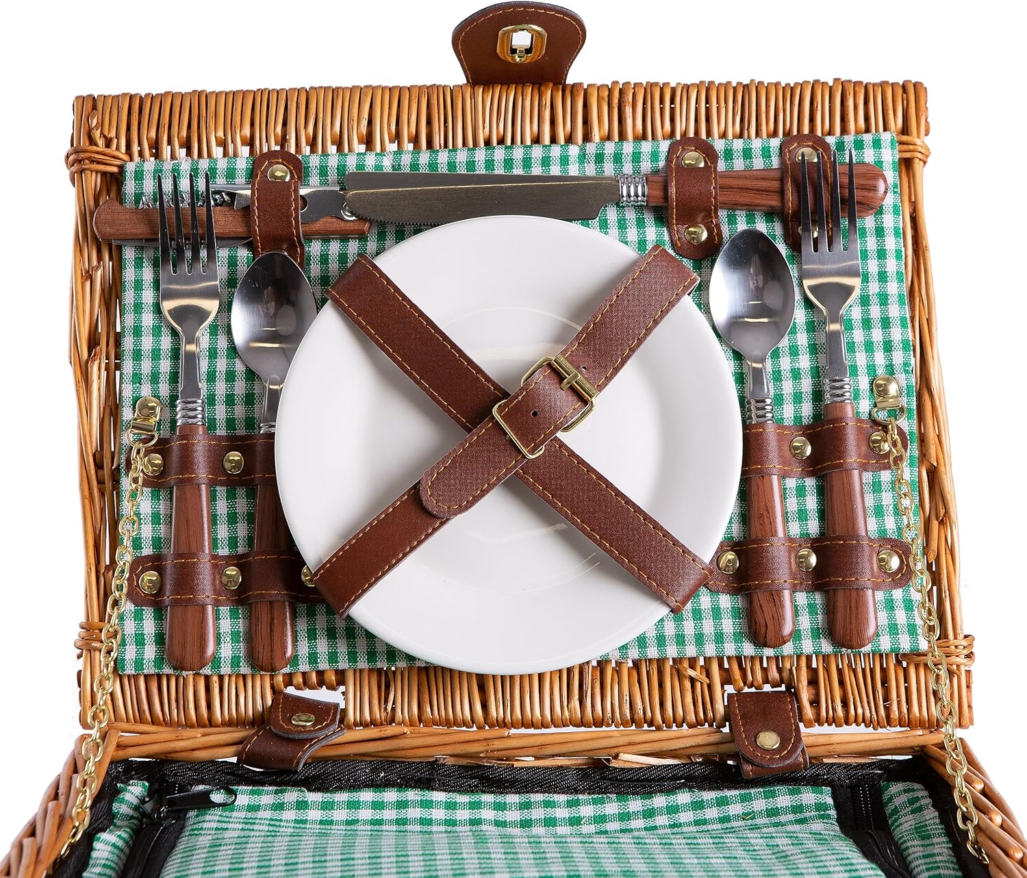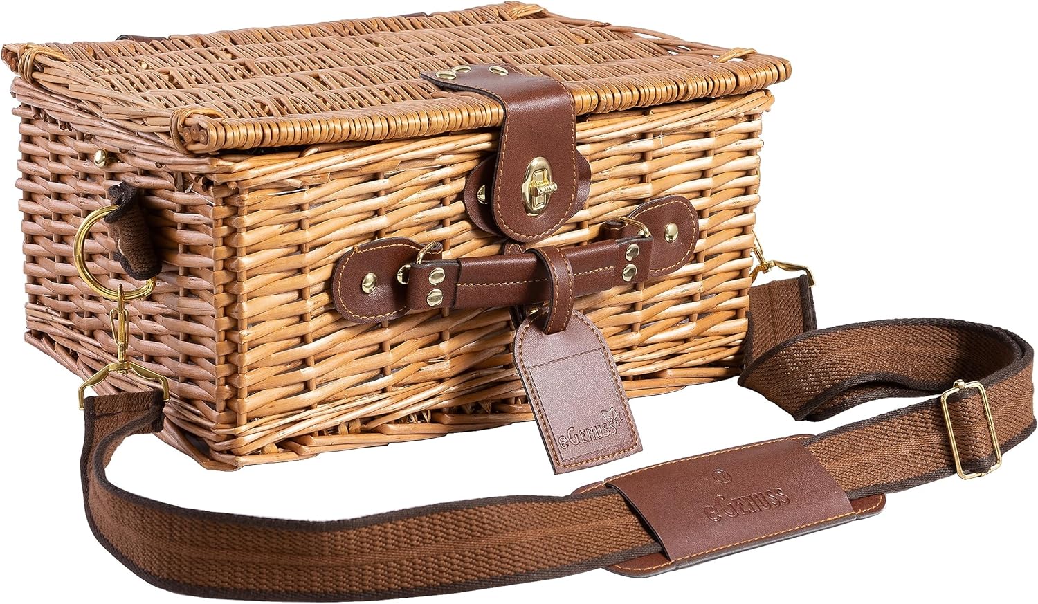 eGenuss Handgefertigtes Picknickkorb für 2 Personen mit abnehmbarem Schultergurt, Kühlfach, Kellnerm