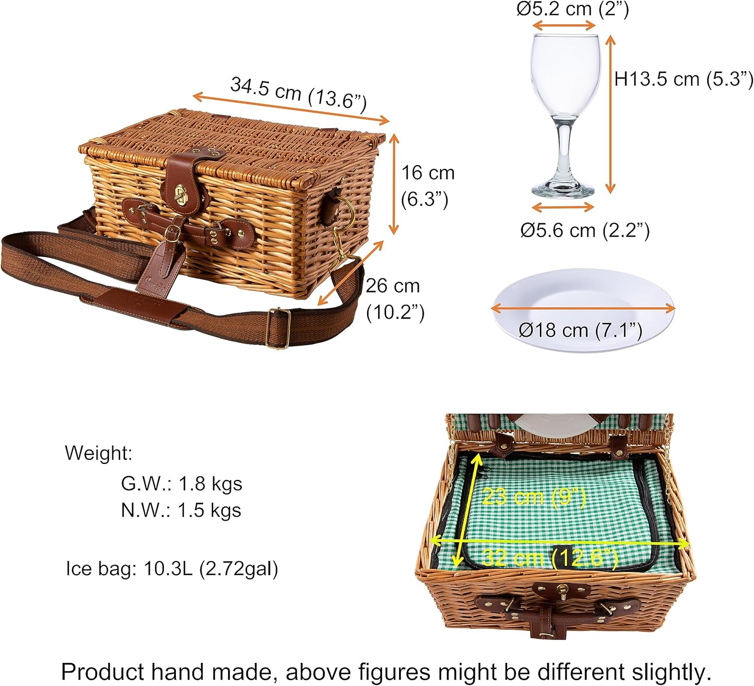 • 🥂 INHALT - 1 Picknickkorb für 2 Personen mit abnehmbarem Schultergurt, Kühlfach und Zubehör. Handgewebt aus Naturweide. Innen und aussen fest fixiert und mit transparentem Faden handgenäht. Stofffutter mit grünem Gingham-Muster.