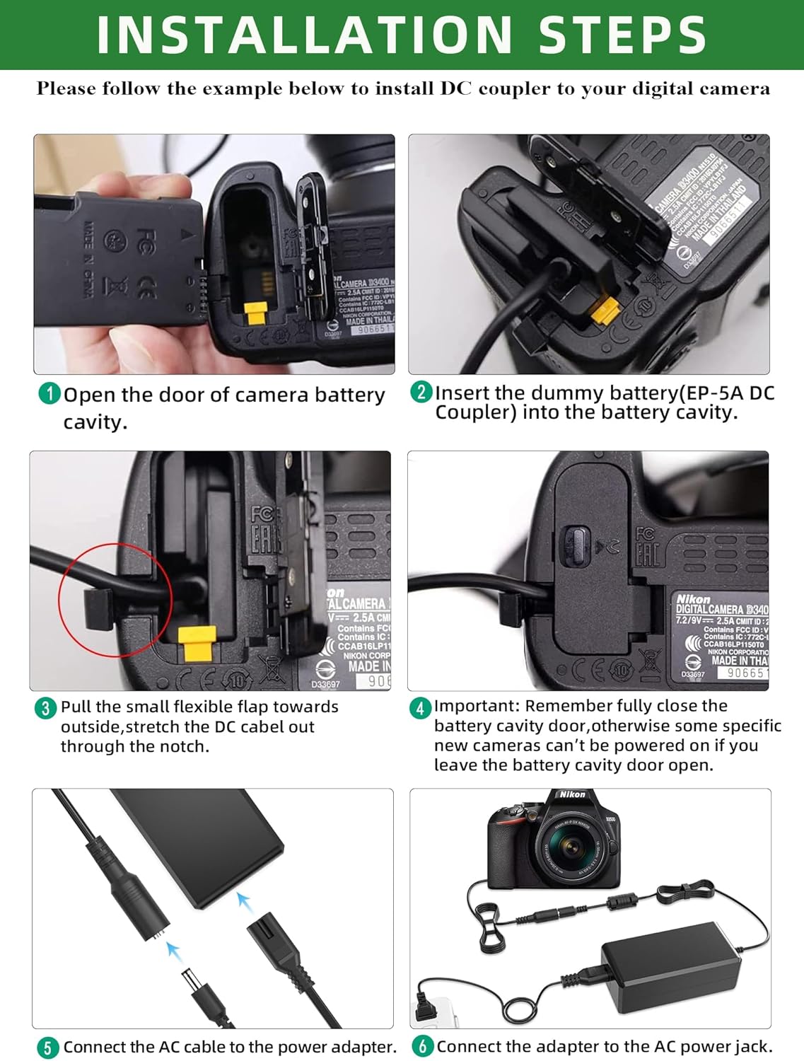 - ANWENDUNG: Die allgemeine Funktion dieses EP-5A-Adapterkits besteht aus AC / DC-Adaptern und wird für Ihre Kamera ohne Kamera-Akku kontinuierlich aufgeladen (Hinweis: Dieses Kit kann den originalen NIKON EP-5A-DC-Koppler und den Nikon EL-14 /