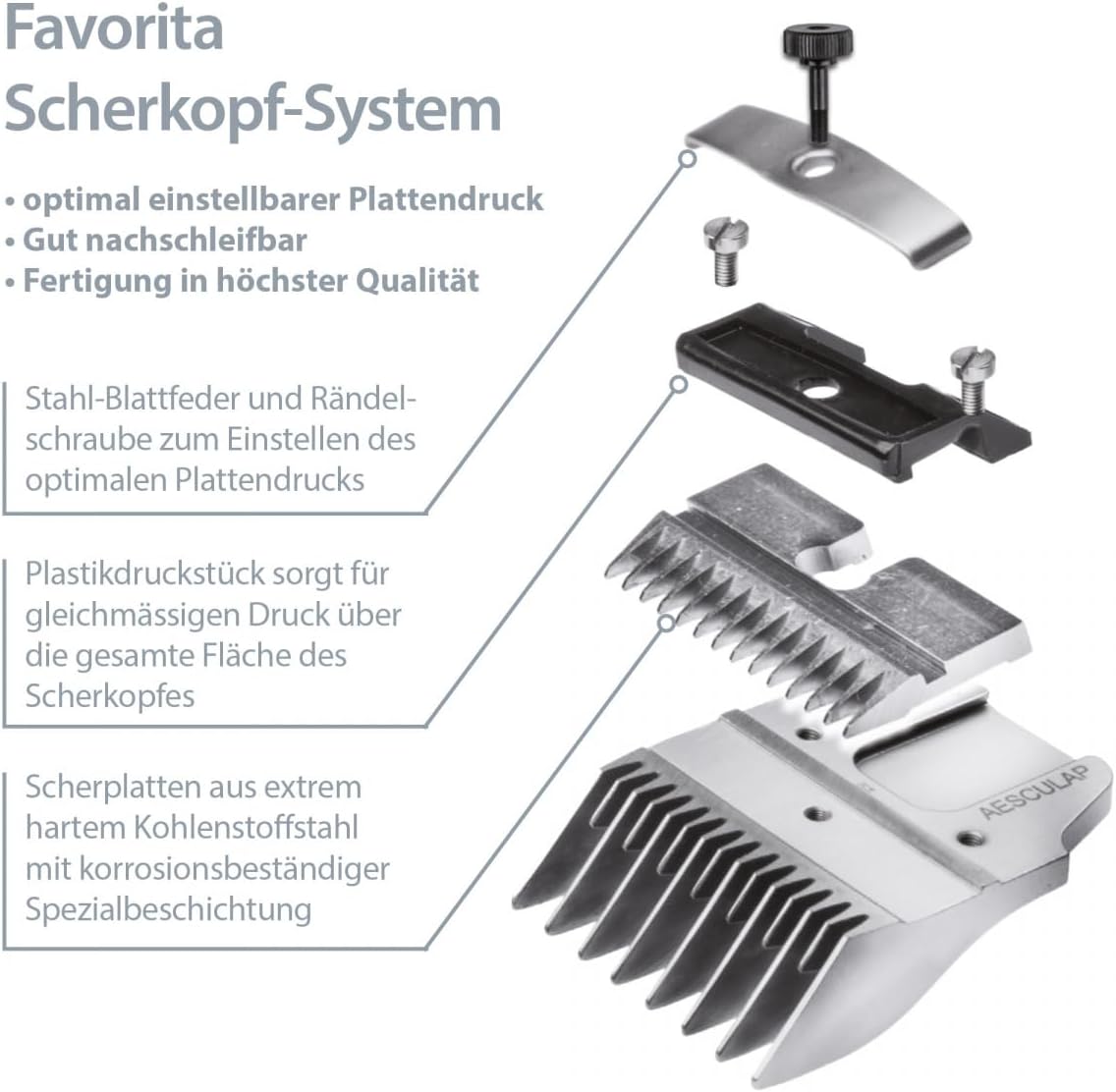 - Der Lieferumfang beträgt 1 Favorita II Schermaschine (GT104) mit 1 Scherkopf bis 5mm, 1 Aesculap Öl (GT604), 1 Gebrauchsanweisung und 1 stabiler Hartschalenkoffer.