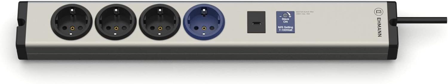 - Elektronische Schaltautomatik 1x Master, 3x Slave, 1x USB-C 18W Slave, präzis einstellbare Schaltschwelle 7-100W