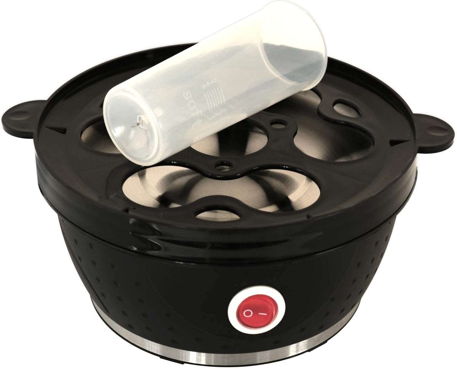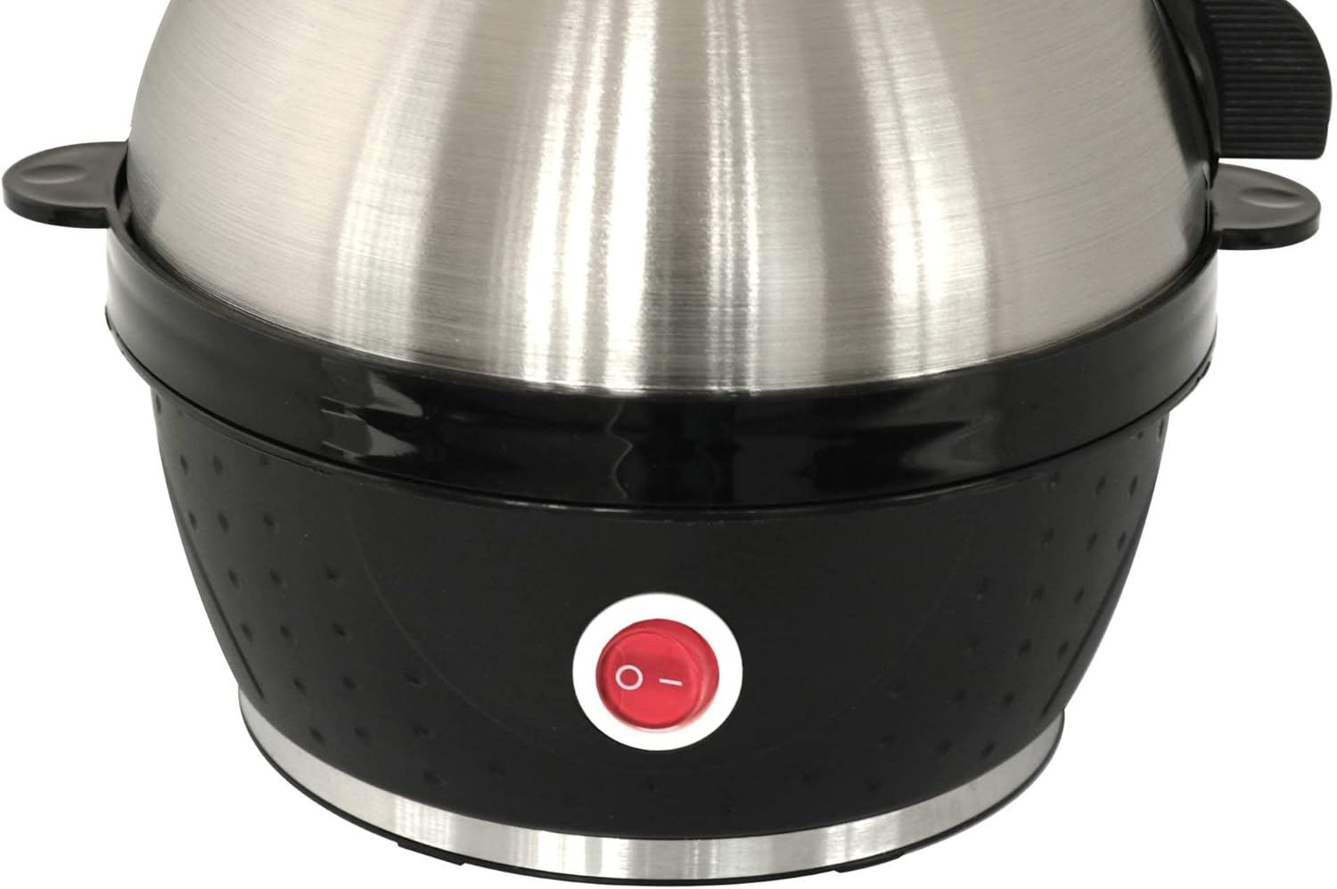 - Edelstahl Heizplatte und Edelstahlgehäuse - Mit 3 Kochstufen (weich/kernweich/hart) durch Messbecher. - Spannungsversorgung: 220-240 V, 50Hz. - mit Kontrollleuchte und Tonsignal - maximale Leistungsaufnahme: 400 Watt - Kapazität: Für bis zu 7 Eier -
