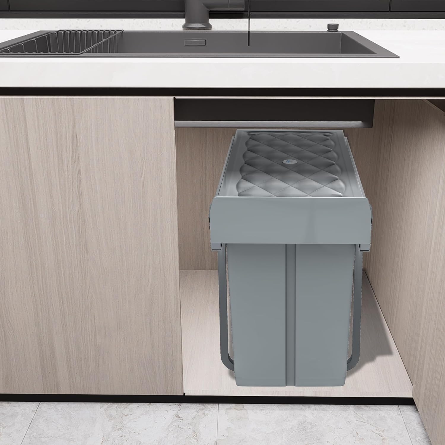 - Eingebettetes Design: Der Mülleimer kann mit Puffergleitschienen und Griffen in den Schrank eingebaut werden, lässt sich leicht herausziehen oder hineinziehen und hat eine Pufferwirkung
