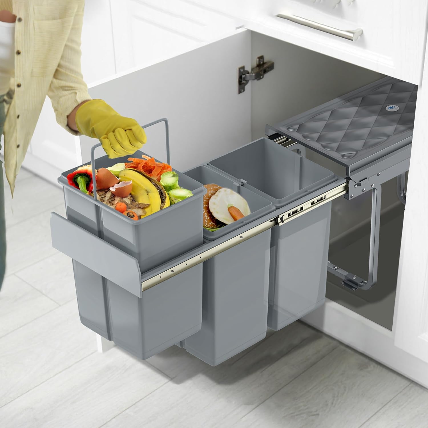 - Müllsortierung: Der Einbaumülleimer optimiert den verfügbaren Platz in der Küche und wird versteckt, wenn Sie ihn nicht brauchen. Er kann den Müll nicht nur sortieren, sondern auch recyceln
