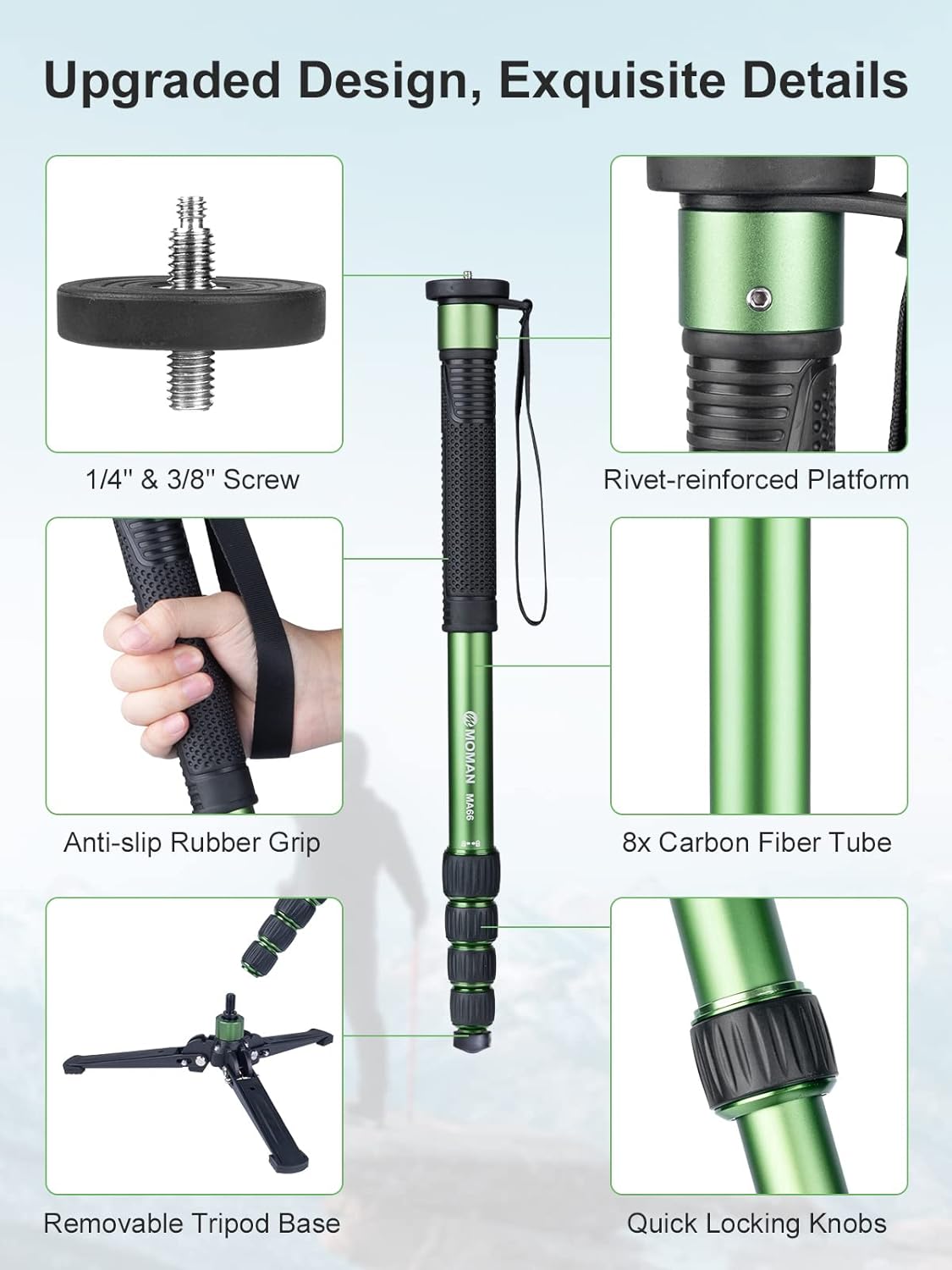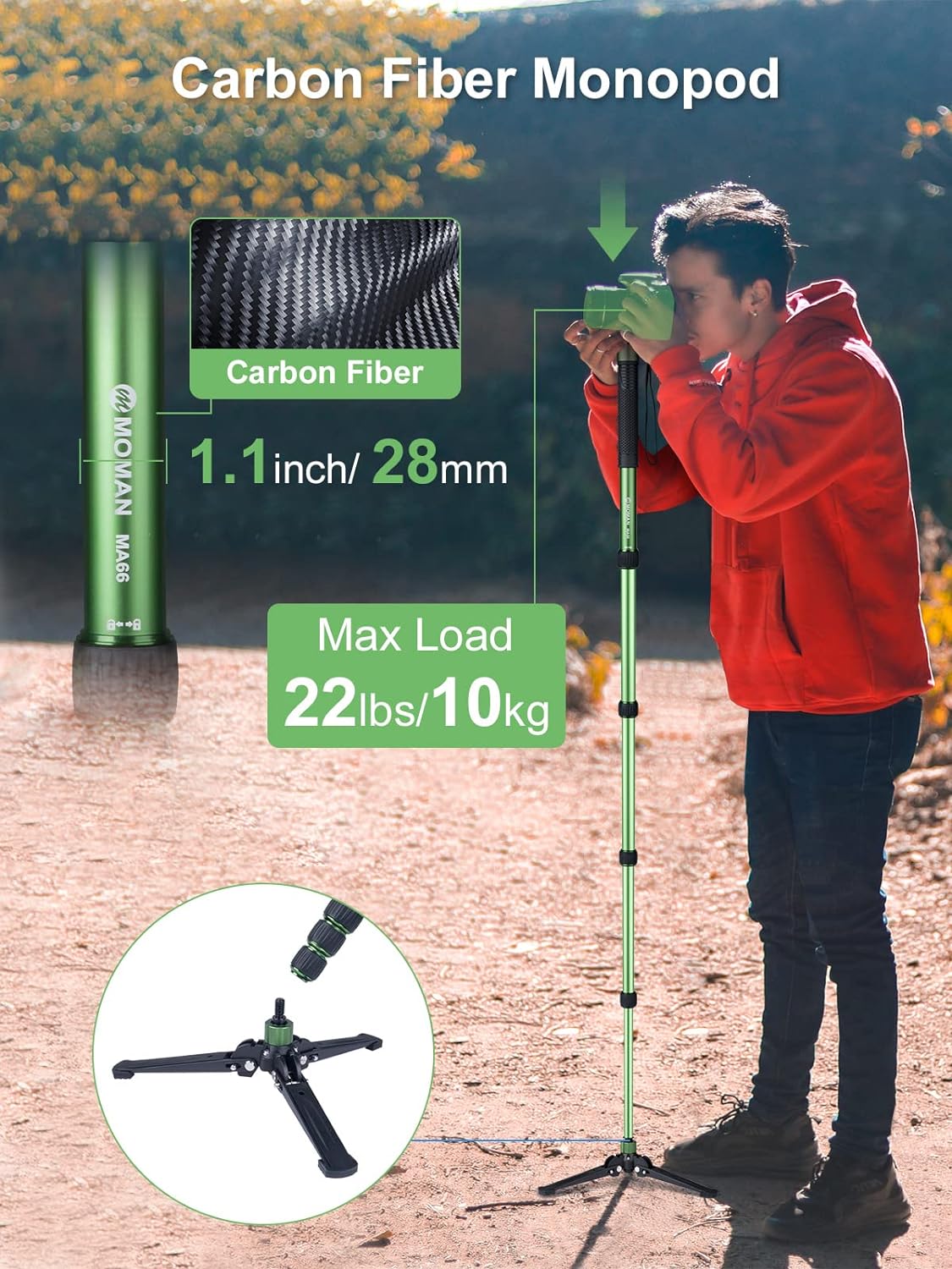• 【Stabileres und haltbareres Kohlefasermaterial】Das Rohr des Moman MA66 Einbeinstativs aus Kohlefaser ist an seinem dicksten Durchmesser 28 mm dick und jedes Bein ist mit einem Knopfverschluss versehen. Die hochwertige Kohlefaser und das