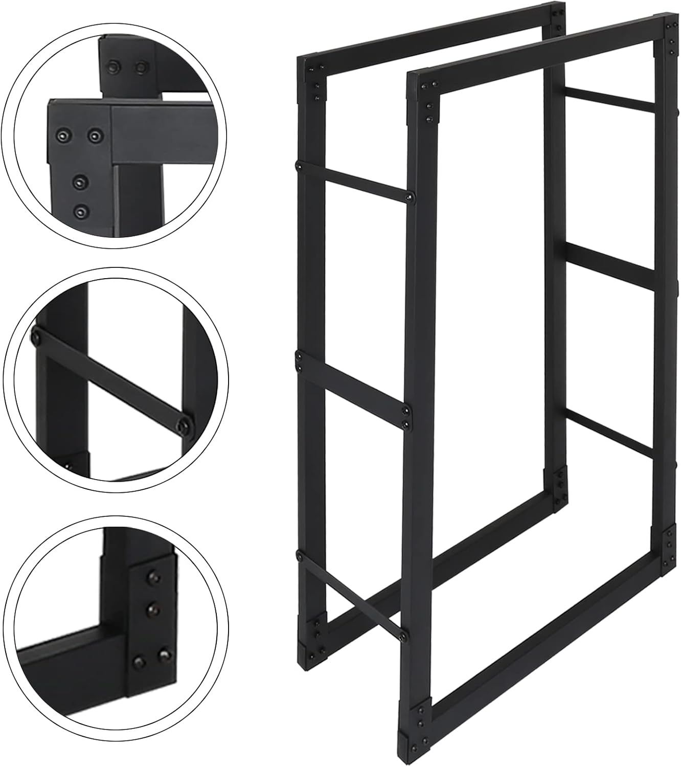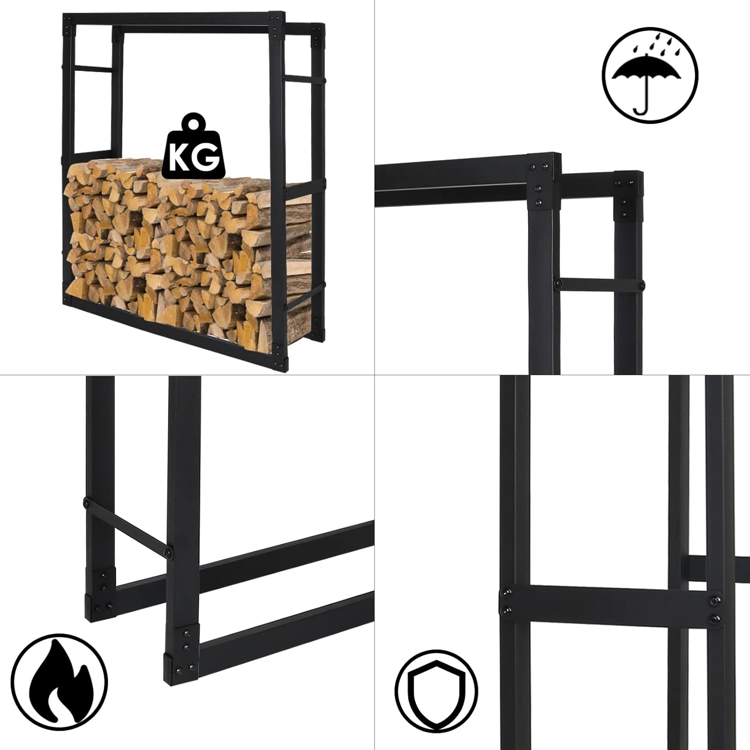 - [Schwarzes Kaminholzregal] Dieses Kaminholzregal kann Brennholz ordentlich stapeln, mit einem hohlen Design für einfachen Zugang und hoher Luftdurchlässigkeit, um die Bildung von Schimmel zu verhindern.