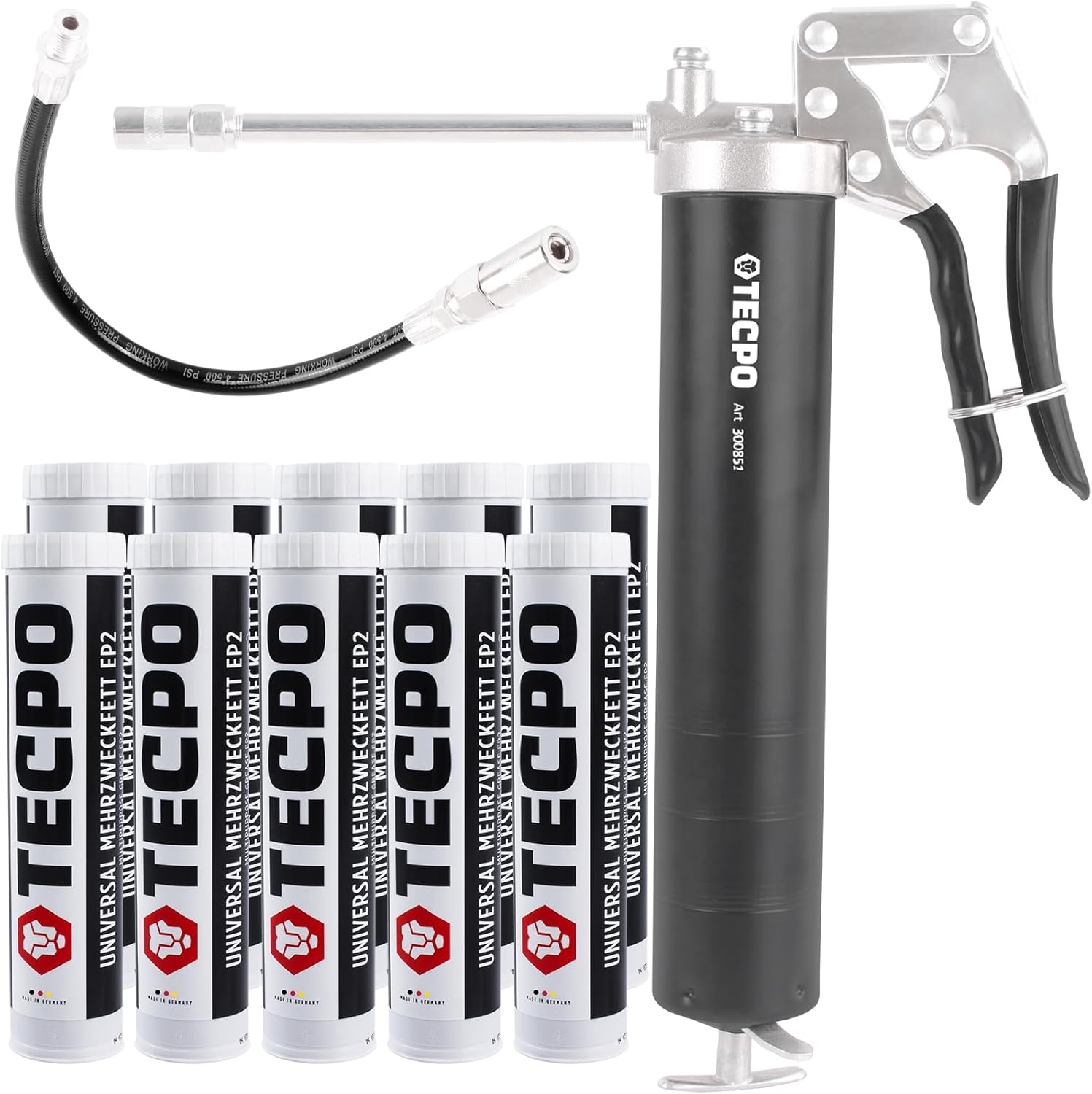 - Lieferumfang: 1x Einhand-Fettpresse, 1x Panzerschlauch für Fettpresse, 10x Universal Mehrzweckfett EP2, 400g