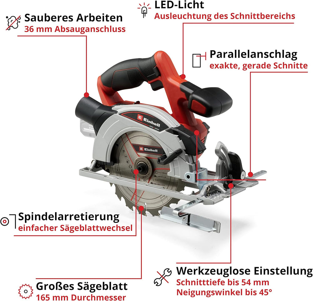 • Die Einhell Akku-Handkreissäge TE-CS 18/165-1 Li - Solo ist klein, leicht und handlich zu bedienen und damit ideal für alle Arbeiten rund um Haus, Garten und Hobby.