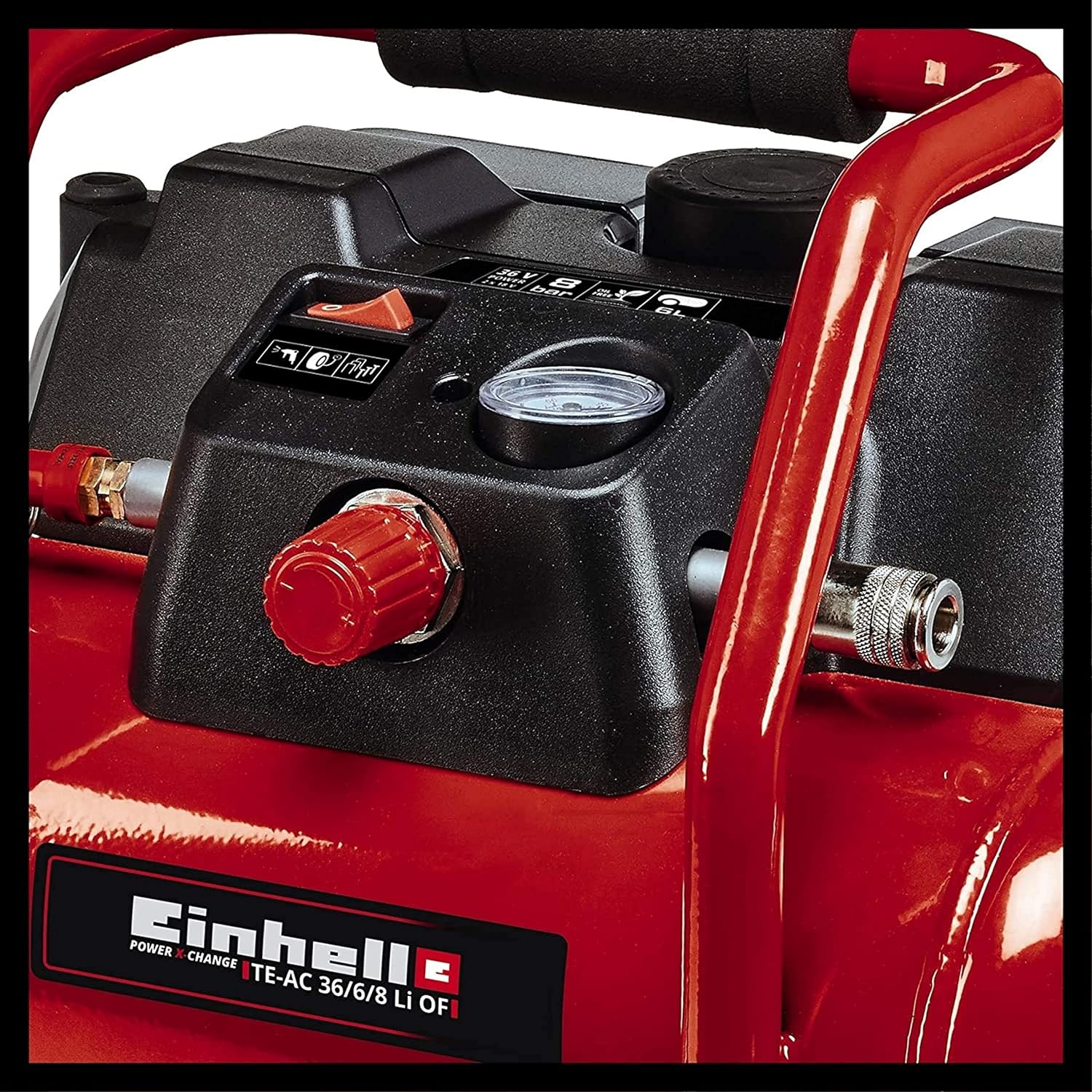 • Der Einhell Akku-Kompressor TE-AC 36/6/8 Li OF Set ist ein mobiler und leistungsstarker Helfer in Heim, Werkstatt oder Garage aus der flexiblen Power X-Change Familie von Einhell.