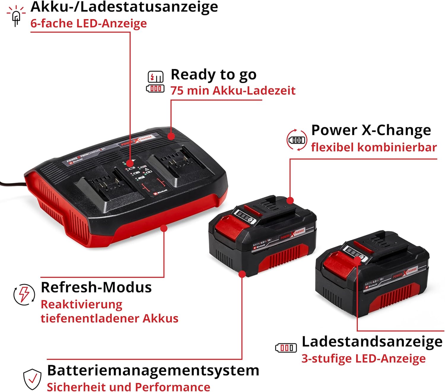 - Der komfortabler Zusatzhandgriff und der Tragegurt sorgen für bequemes Arbeiten. Die Lieferung erfolgt inkl. 2x 4,0 Ah Akkus und Twincharger