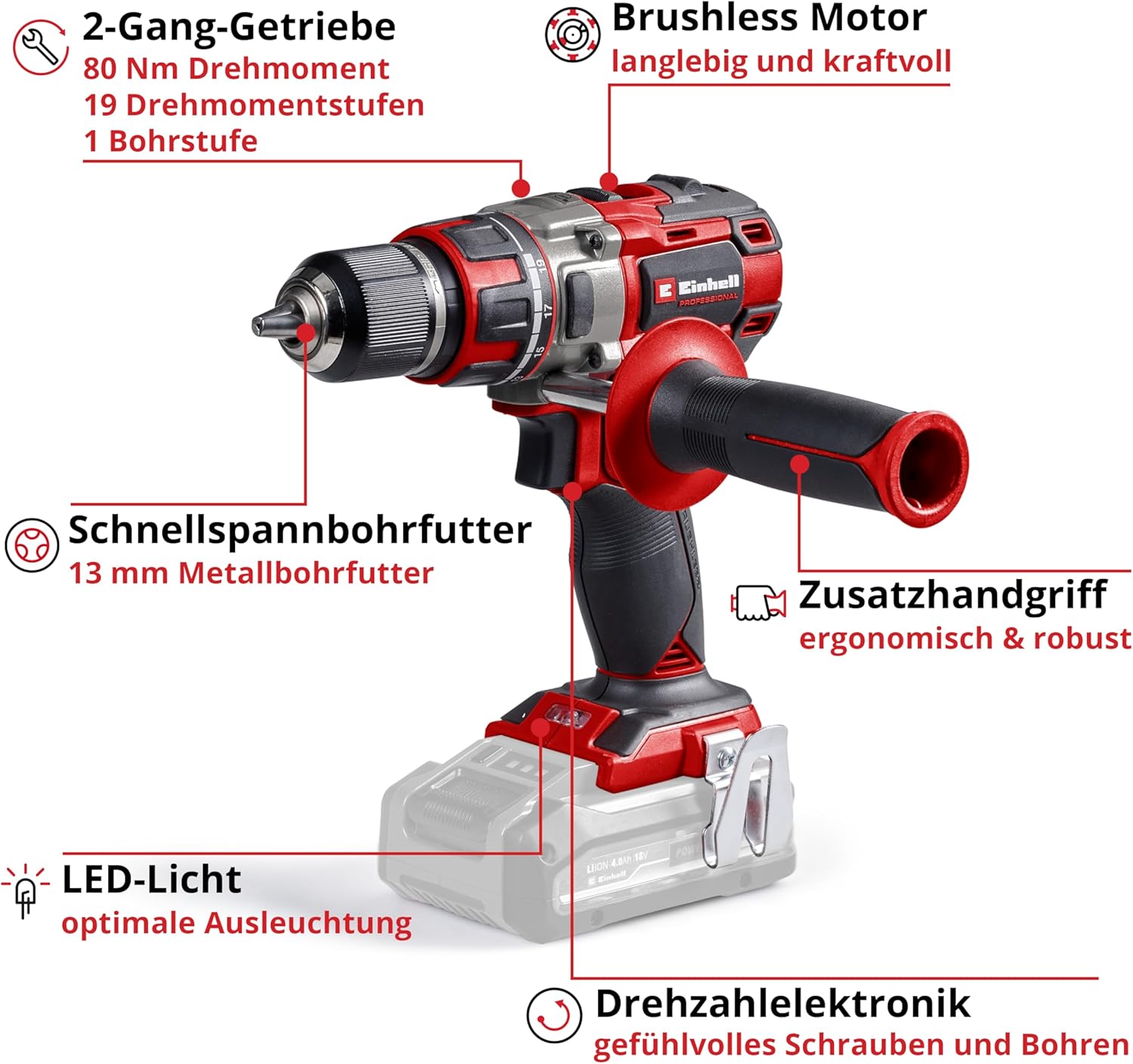 - Lieferung ohne Akku – Der Einhell Professional Akku-Bohrschrauber TP-CD 18/80 Li BL-Solo wird ohne Power X-Change Akku und ohne Ladegerät geliefert. Diese sind separat erhältlich.