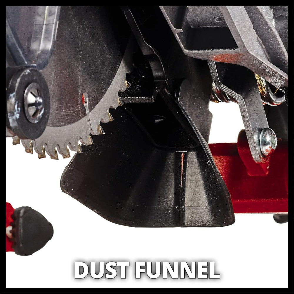 - Durch den Spindle-Lock und die gut ereichbare Sägeblattschraube wird der Sägeblattwechsel erleichtert. Zur verbesserten Sägemehlabfuhr befindet sich hinter dem Sägeblatt ein Staubfangtrichter