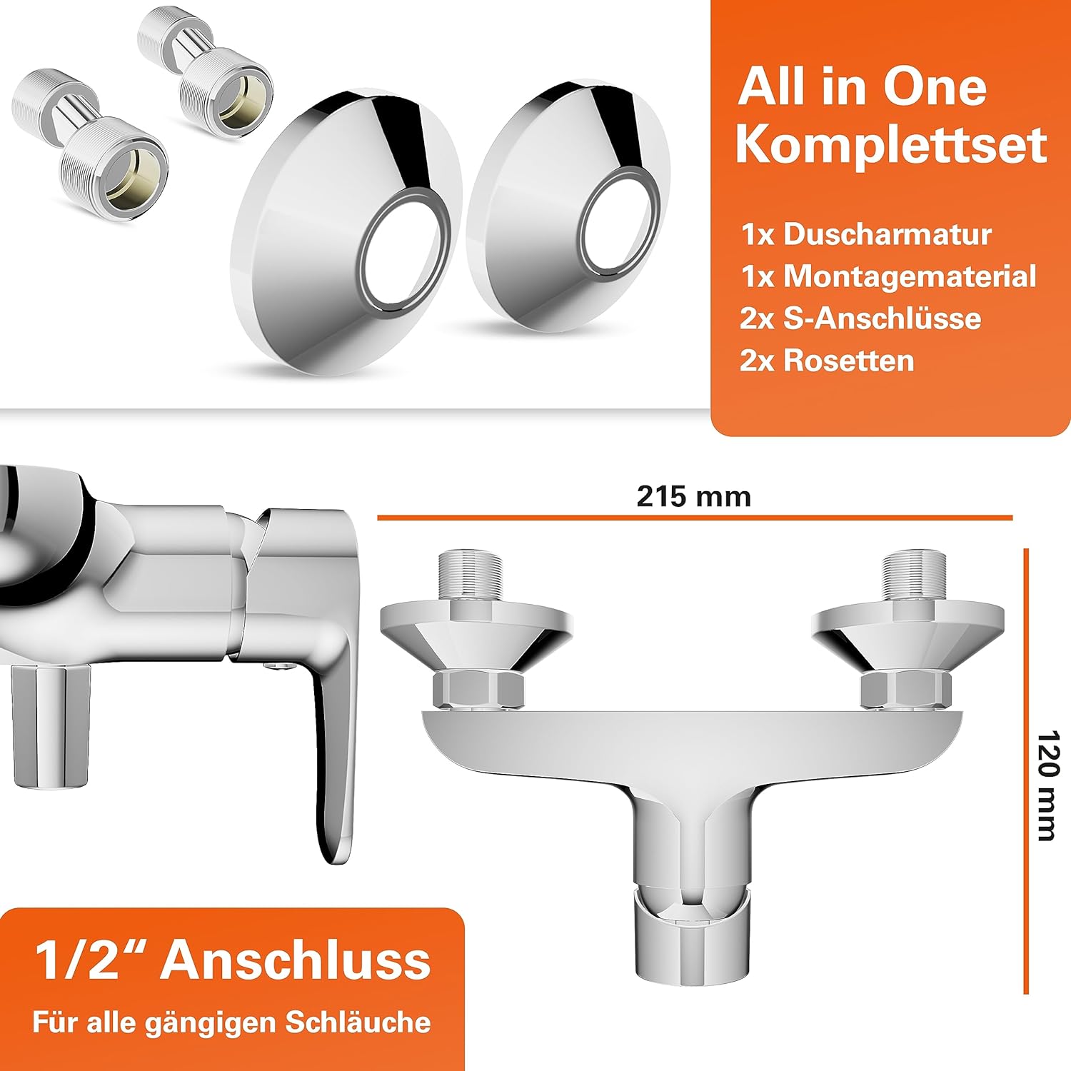 • LIEFERUMFANG: 1 x Brausearmatur (185 x 120 x 128 mm), Ausladung: ca. 128 mm, Montageset: 2 x S-Anschluss, 2 x Abdeckkappe (Rosette)