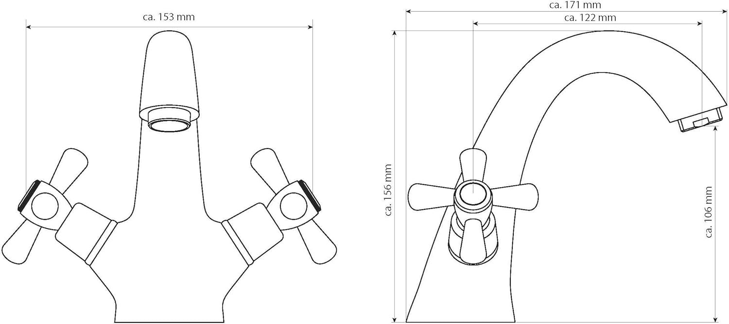 - LIEFERUMFANG: 1 x Waschbeckenarmatur, (153 x 156 x 171 mm), Ausladung: ca. 122 mm, Anschlussschläuche: 2 x Flexschläuche 350 mm, 1 x 11/4“ Ablaufgarnitur (Stangen-Exzenter)