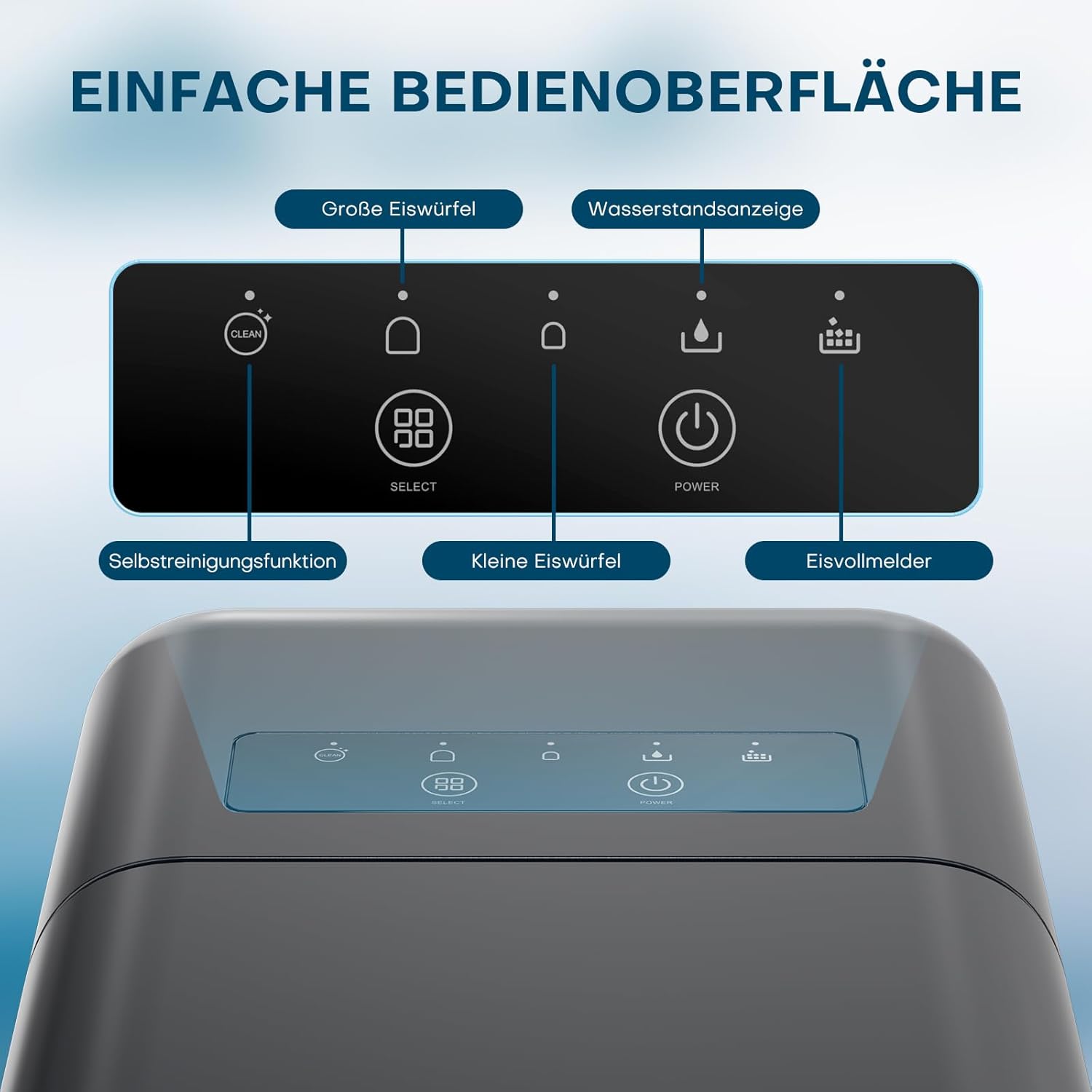 - Einfach zu bedienen: Das Bedienfeld des ice cube maker ist sehr einfach, mit nur drei Modi: grosses Eis, kleines Eis und automatische Reinigung. Ausgestattet mit einer Eisschaufel und einem Eiskorb, was es bequemer macht. Darüber hinaus verfügt der