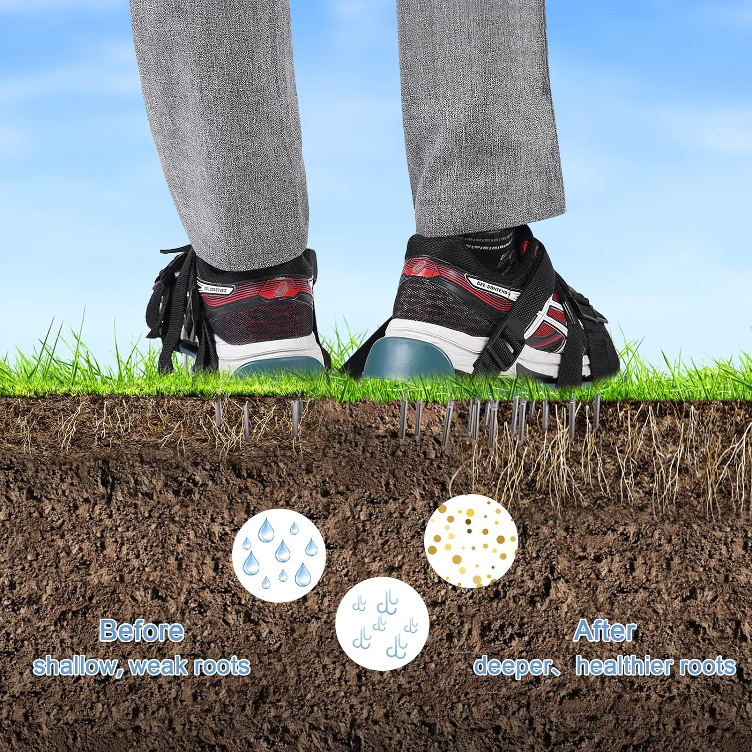 - 【Ein gutes Werkzeug zum Lockern des Bodens】Jede Sohle enthält 13 Eisenspikes; Rasenspikes können einfach und schnell auf niedrigem Boden befestigt werden, wobei sich der Luftkanal auf dem dichten Boden öffnet, um Wasser, Nährstoffe und Luft aus