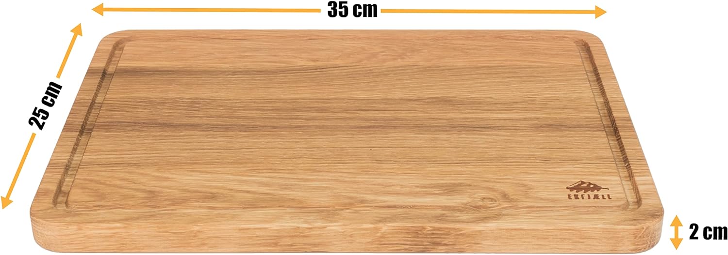 - 🌱 HANDLING: Das Eichenholzschneidebrett mit den Massen von 35x25x2 cm verfügt ringsum über eine Saftrille, die dafür Sorge trägt, dass Flüssigkeiten nicht vom Schneidebrett auf Ihre Arbeitsplatte gelangen. Das helle Holz besticht mit einer edlen