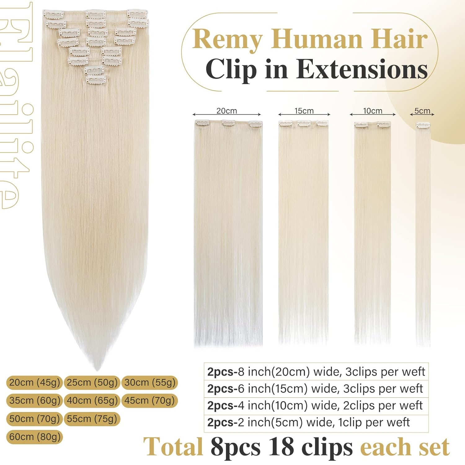 • 💎 Normal Weft: 45-80g. 8 Tressen (Haarteile) 18 Clips: 2x20cm breite Tressen (jeweils 3 clips), 2x15cm breite Tressen (jeweils 3 clips), 2x10cm breite Tressen (jeweils 2 clips), 2x5cm breite Tressen (jeweils 1 clip).