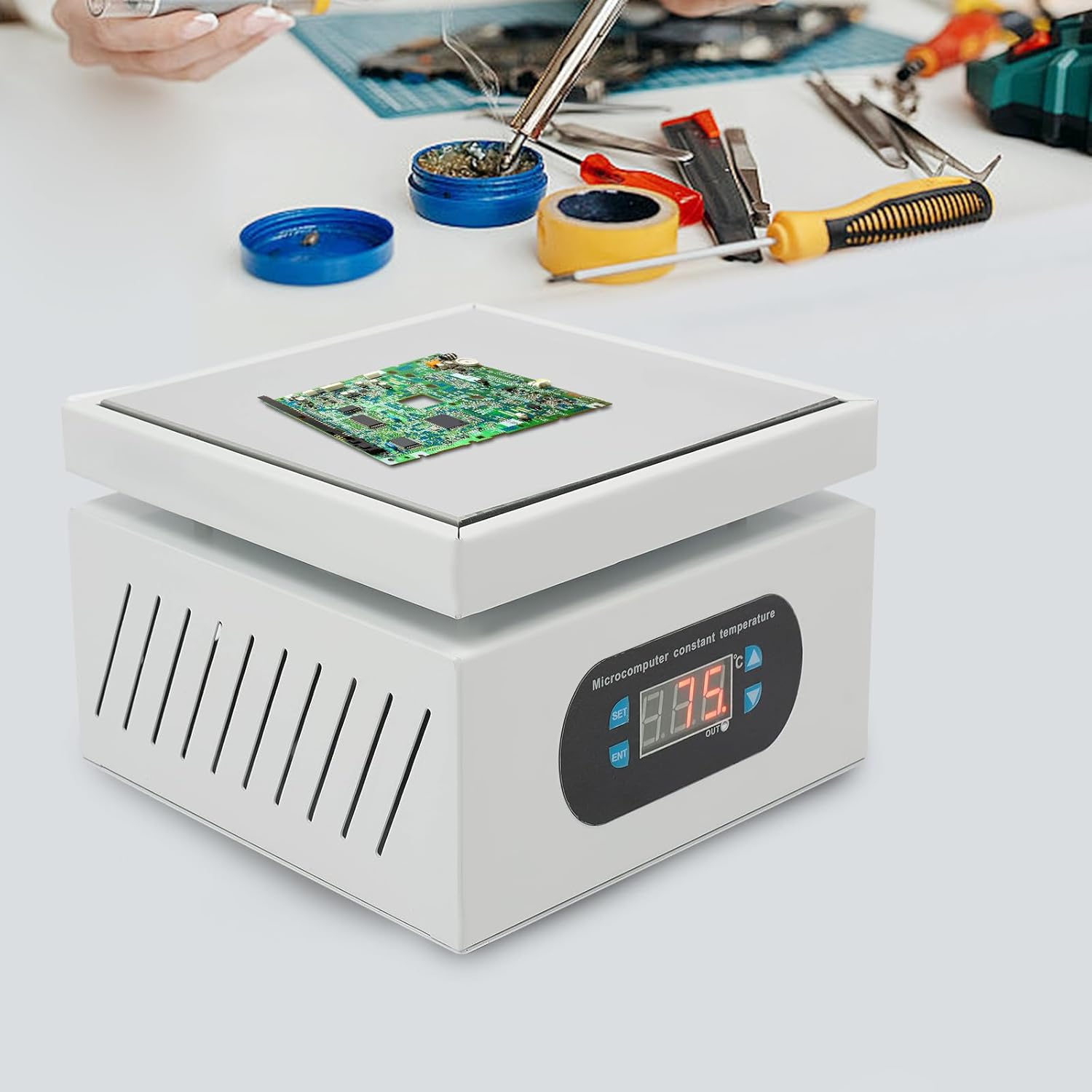 - Schnelles Aufheizen: 500W hohe Leistung, hohe Wärmeleitfähigkeit Aluminiumlegierung Heizplatte mit grosser Heizfläche (5,91*5,91 Zoll) können gleichmässige Erwärmung, schnelle Erwärmung, hohe Temperatur ohne Verformung zu erreichen, verbessern Sie